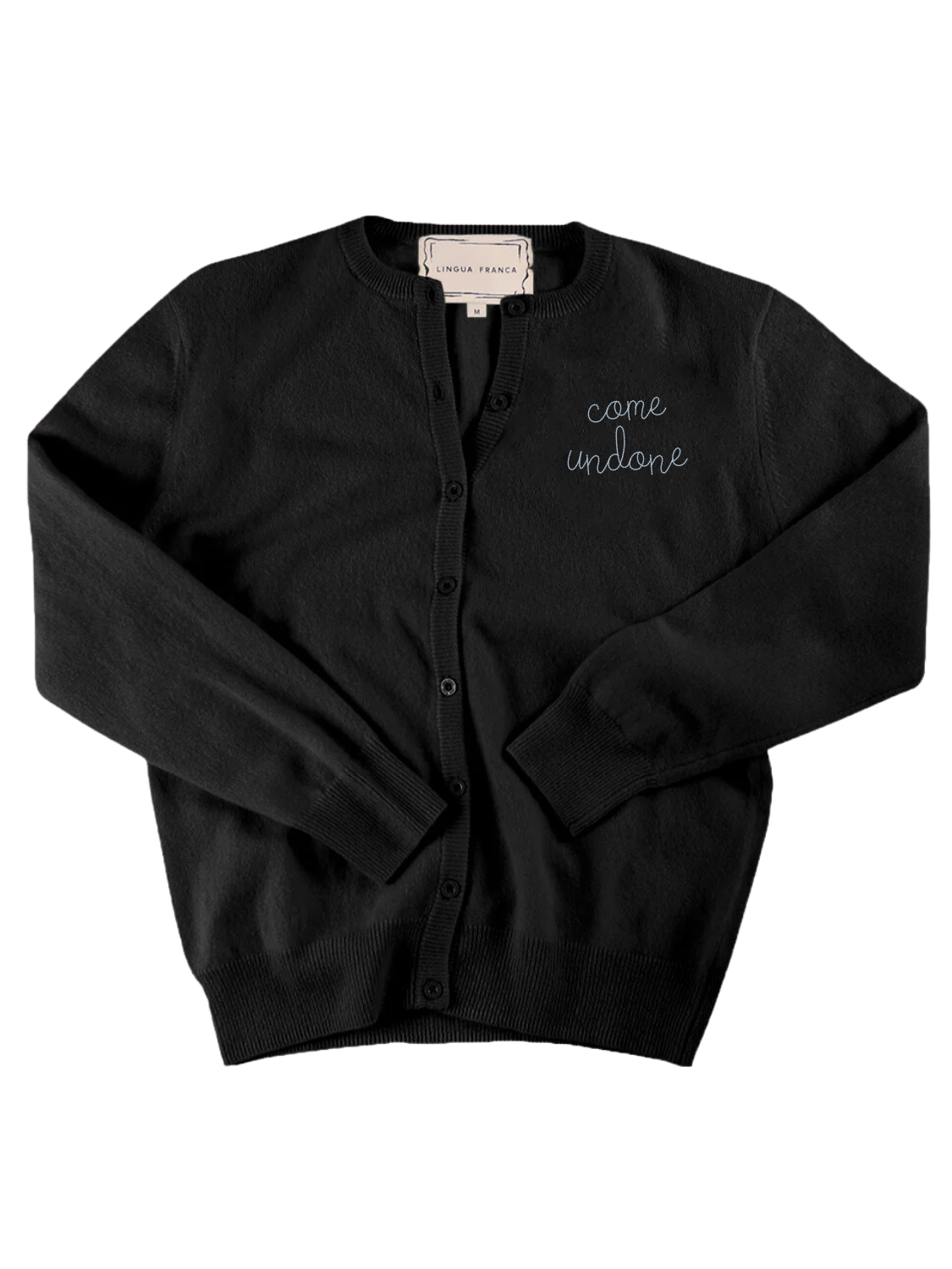 Our classic cardigan with "come undone" embroidered over the heart.