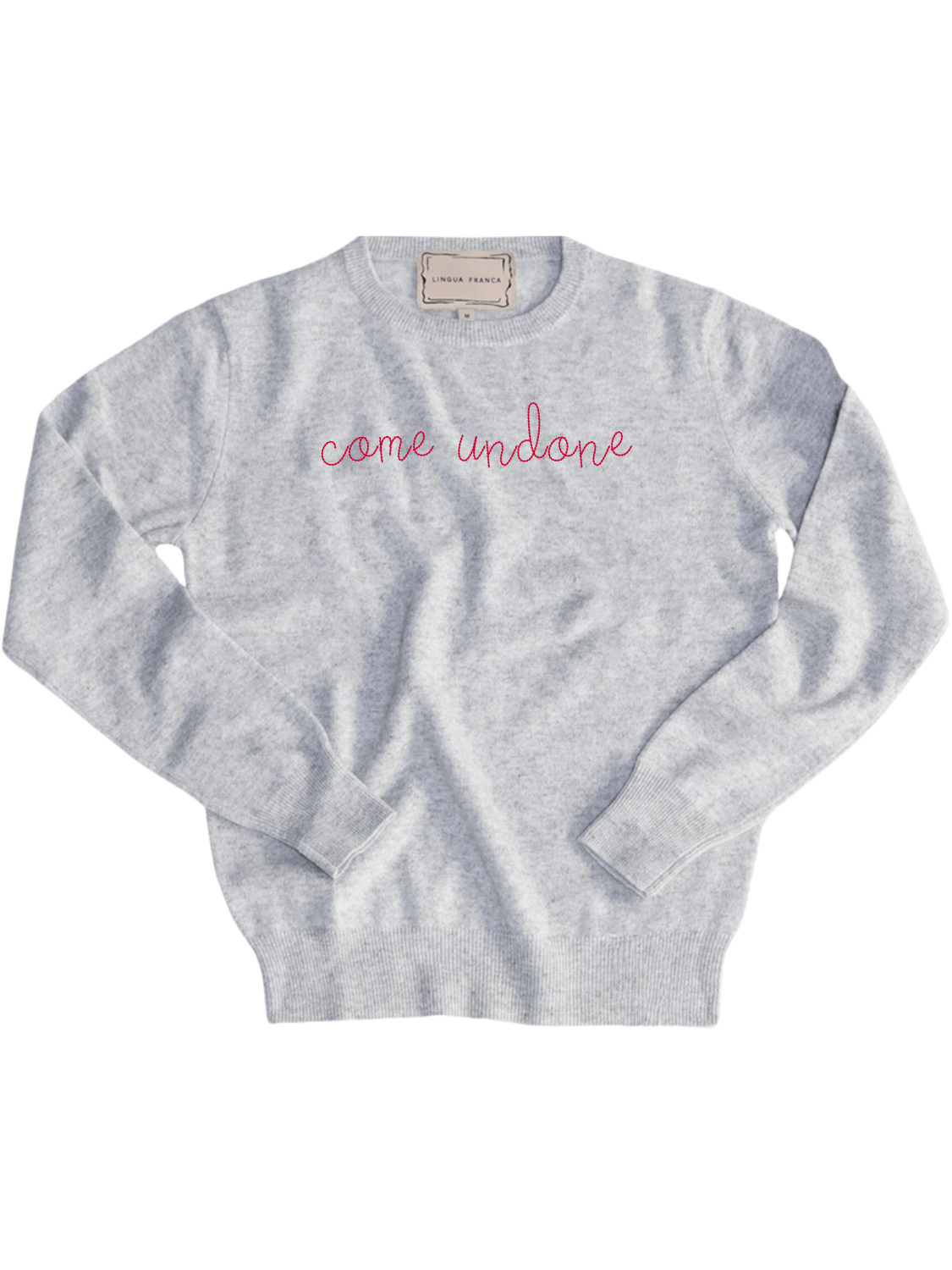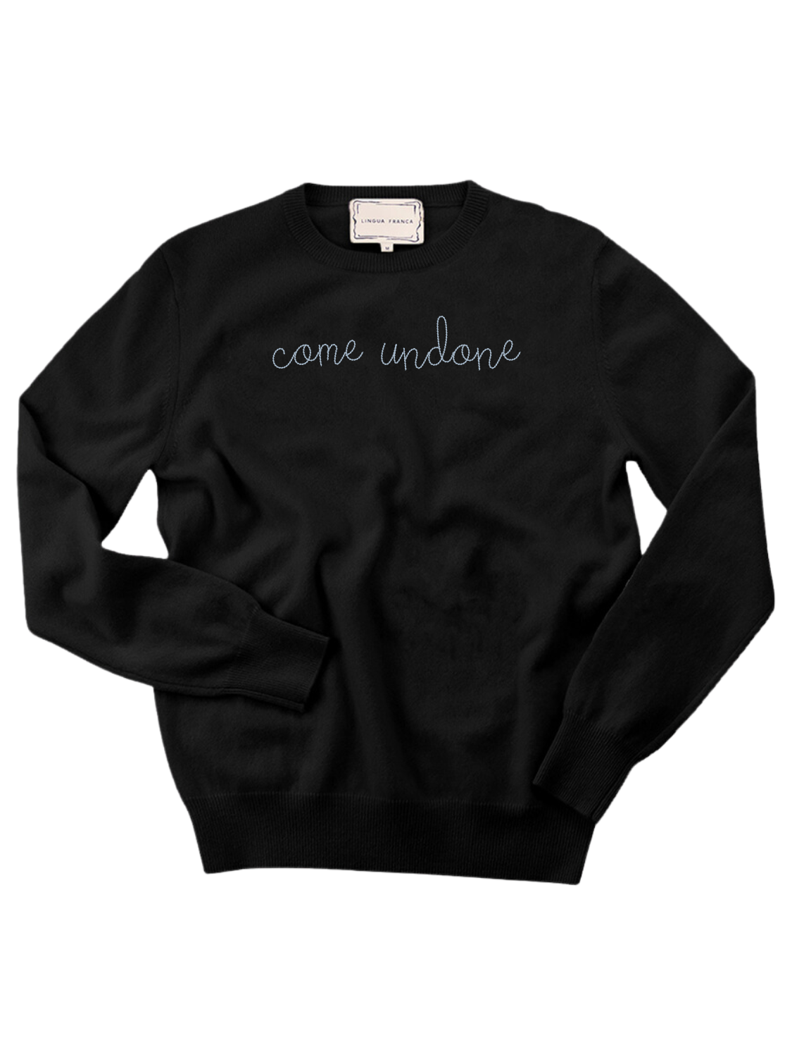 Our classic cashmere crewneck with "come undone" hand-embroidered across the front.