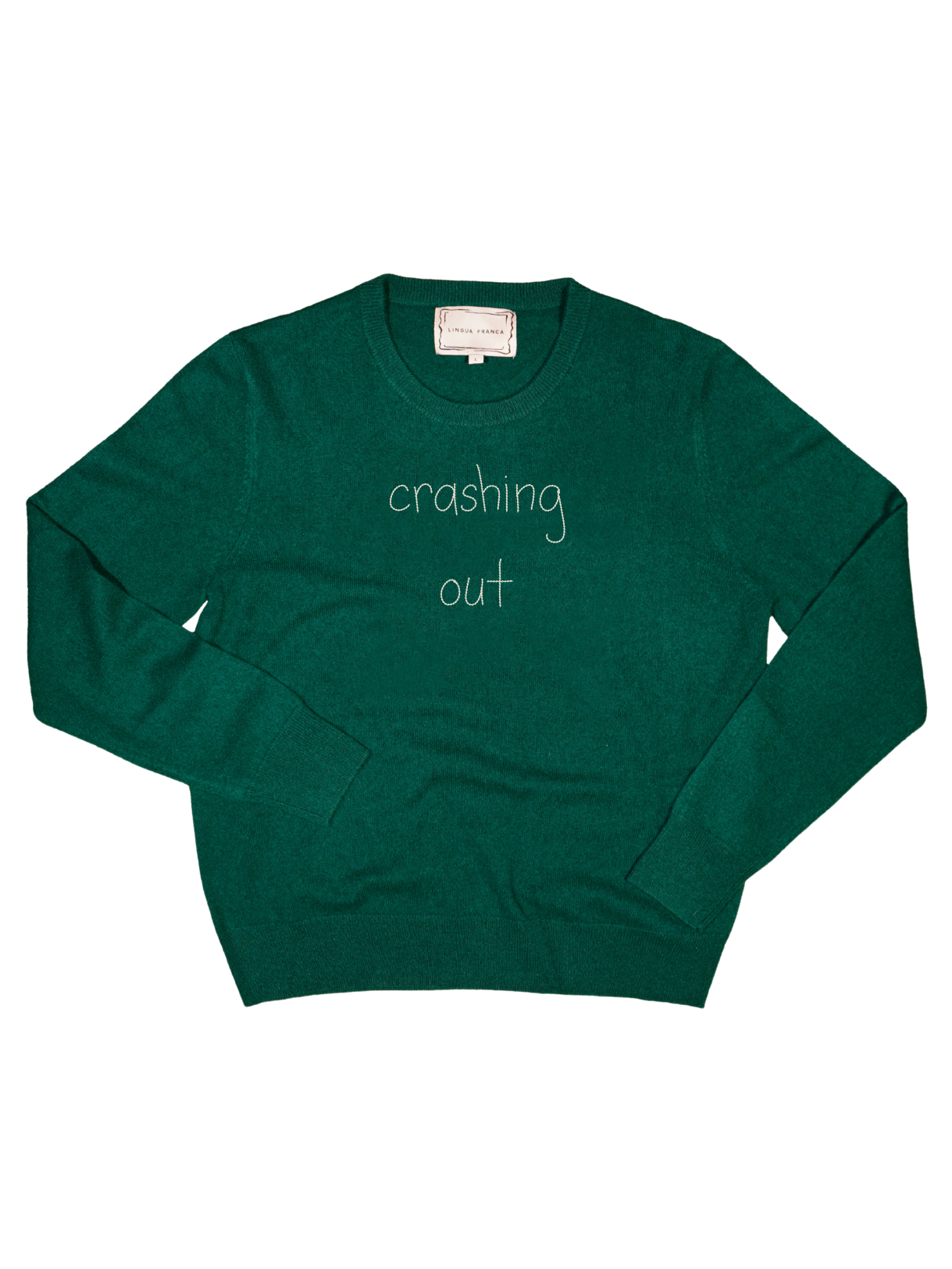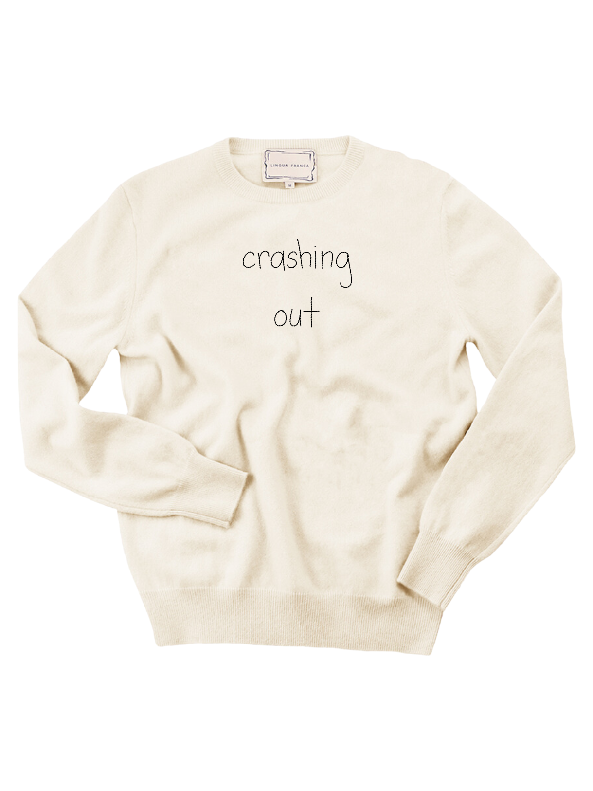 Our classic cashmere crewneck with "crashing out" hand-embroidered across the front.