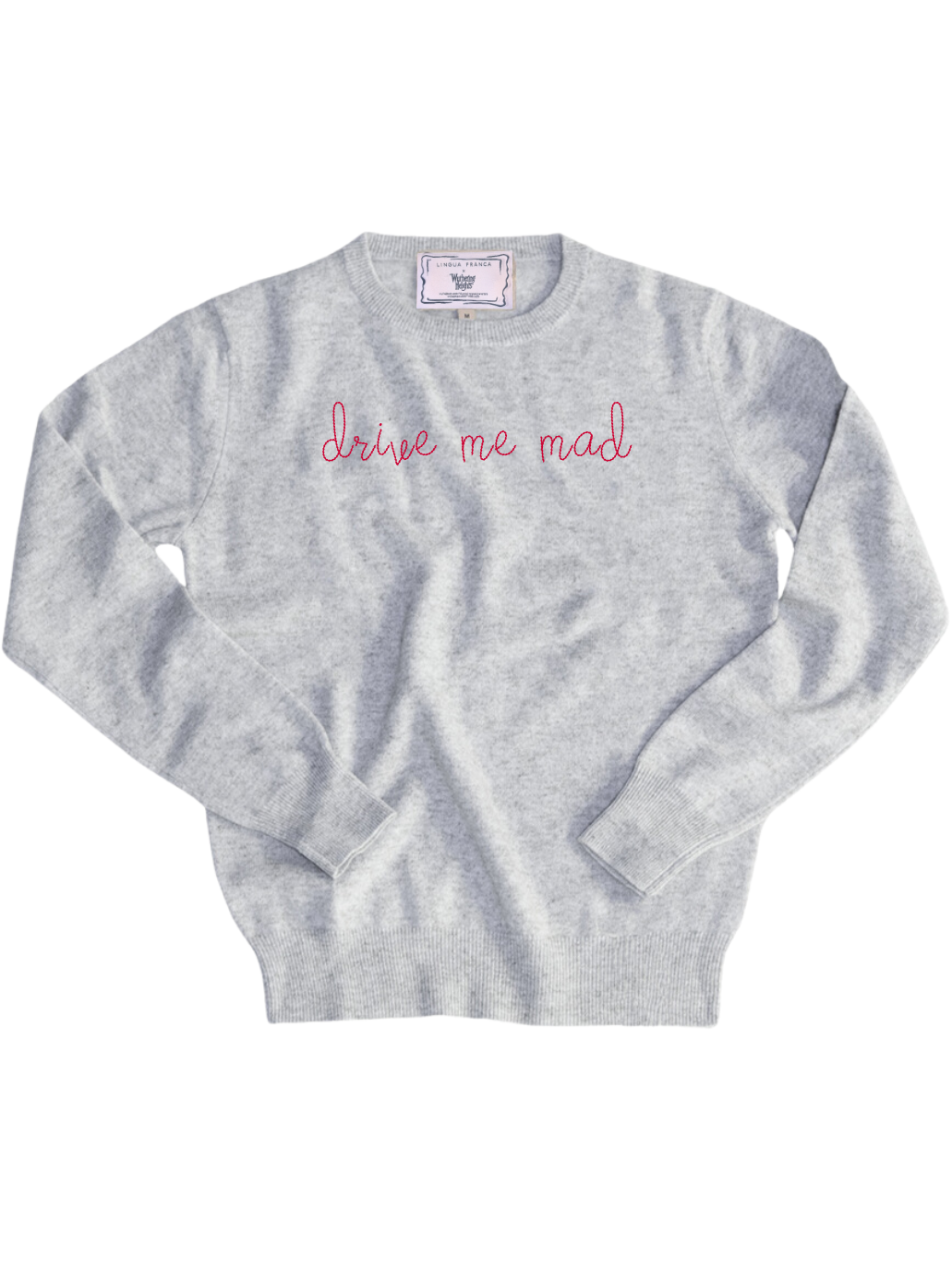 Our classic cashmere crewneck with "drive me mad" hand-embroidered across the front.