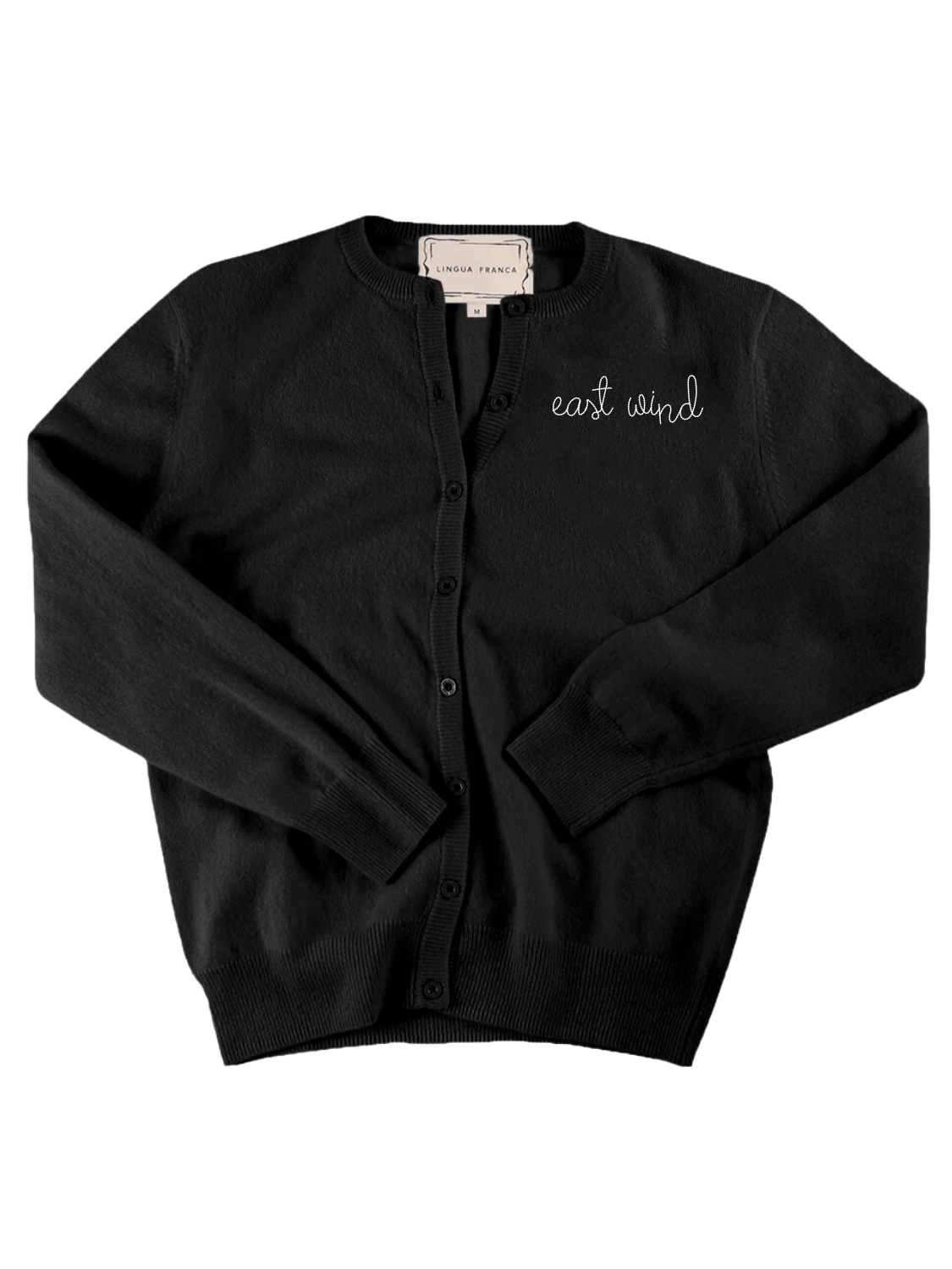 Our classic cashmere cardigan with "east wind" hand-embroidered above the heart.