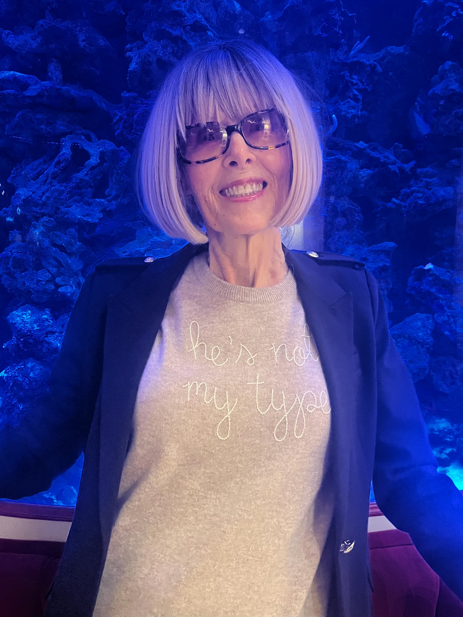 Our classic cashmere crewneck with "he's not my type" hand-embroidered across the front.