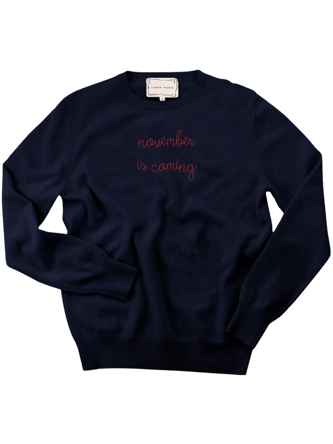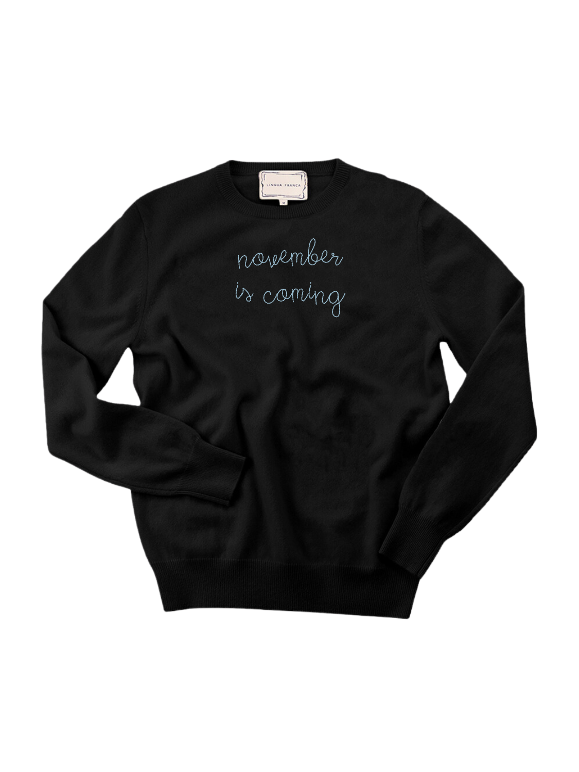 Our classic cashmere crewneck with "november is coming" hand-embroidered across the front.
