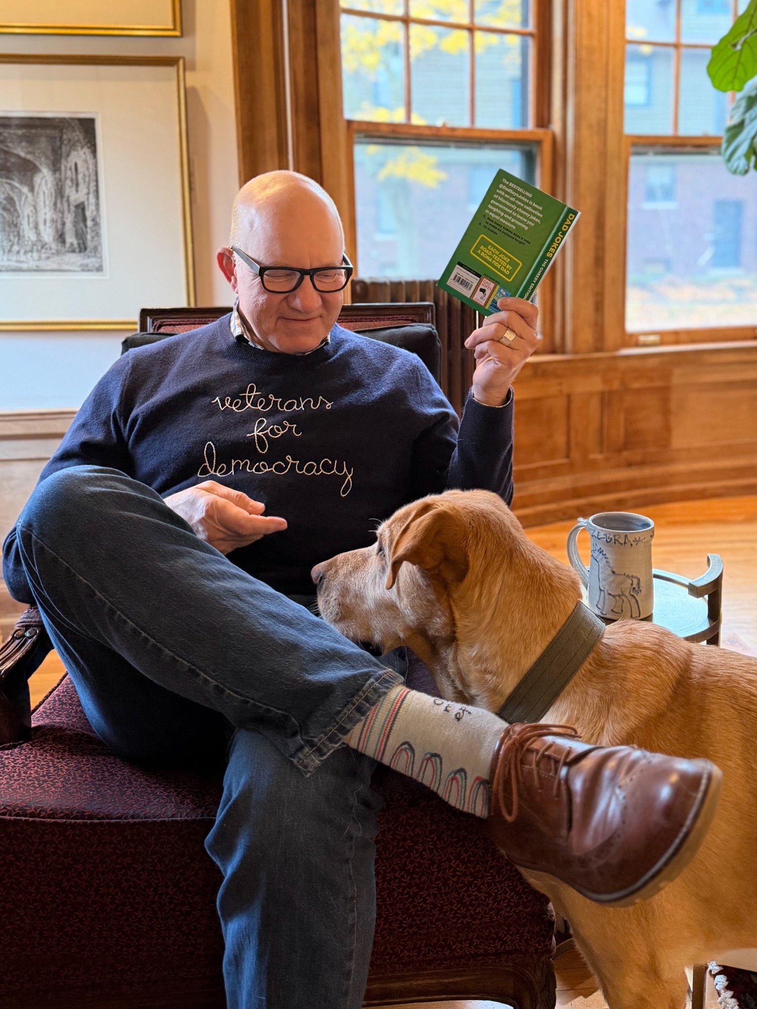 Our classic cashmere crewneck with "veterans for democracy" hand-embroidered across the front.