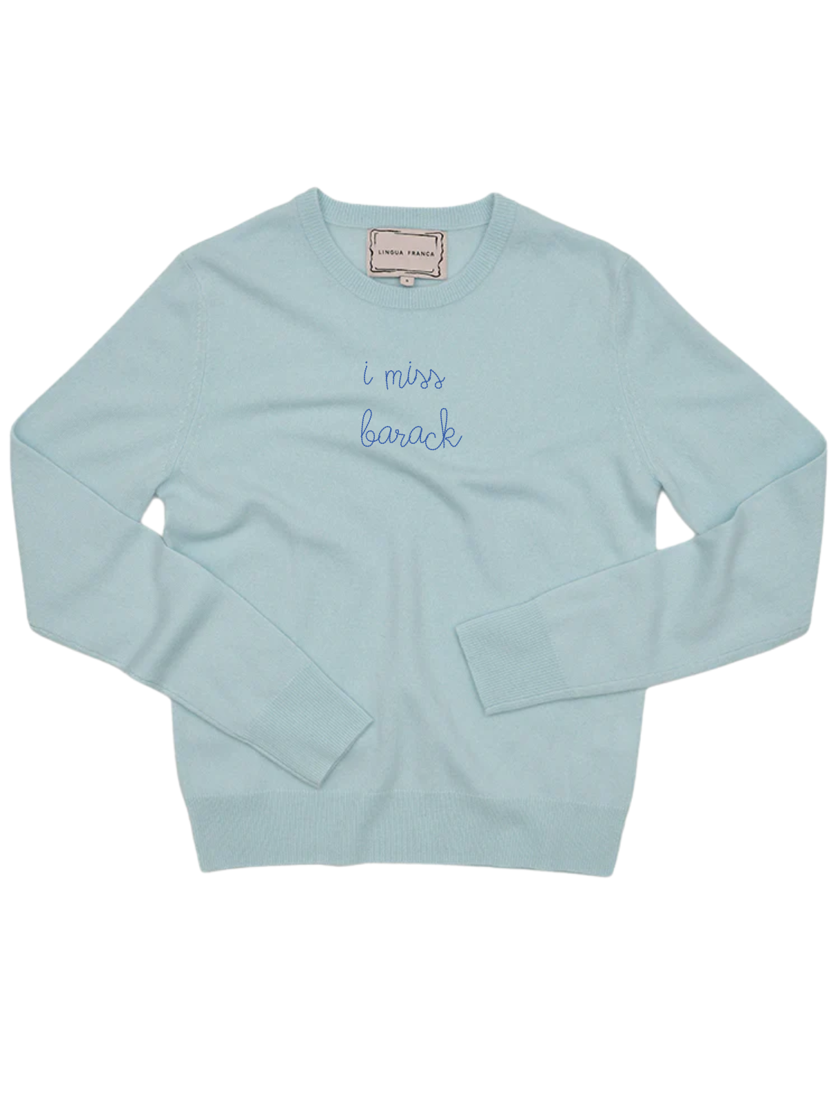 Our classic cashmere crewneck with "i miss barack" hand-embroidered across the front.