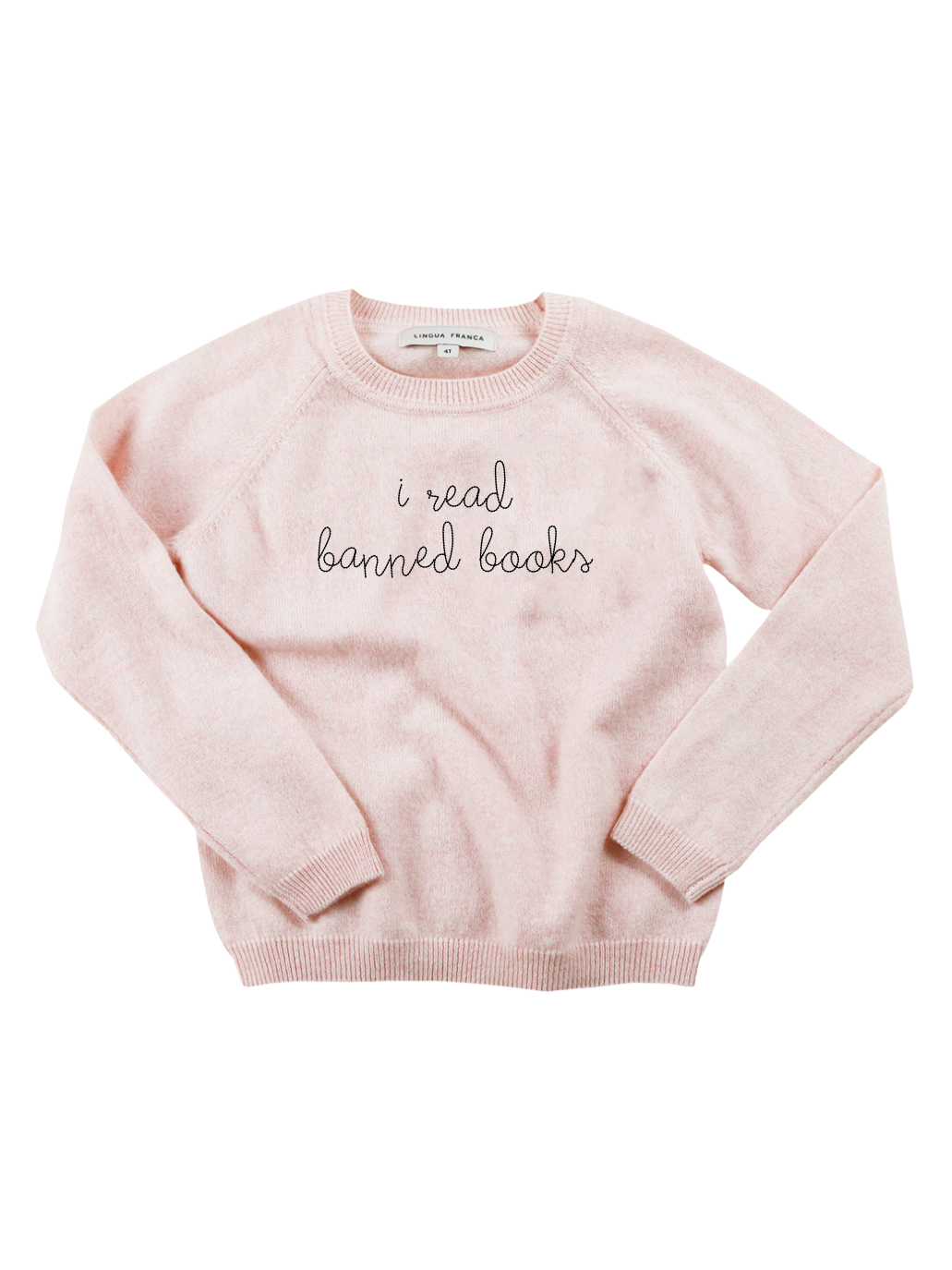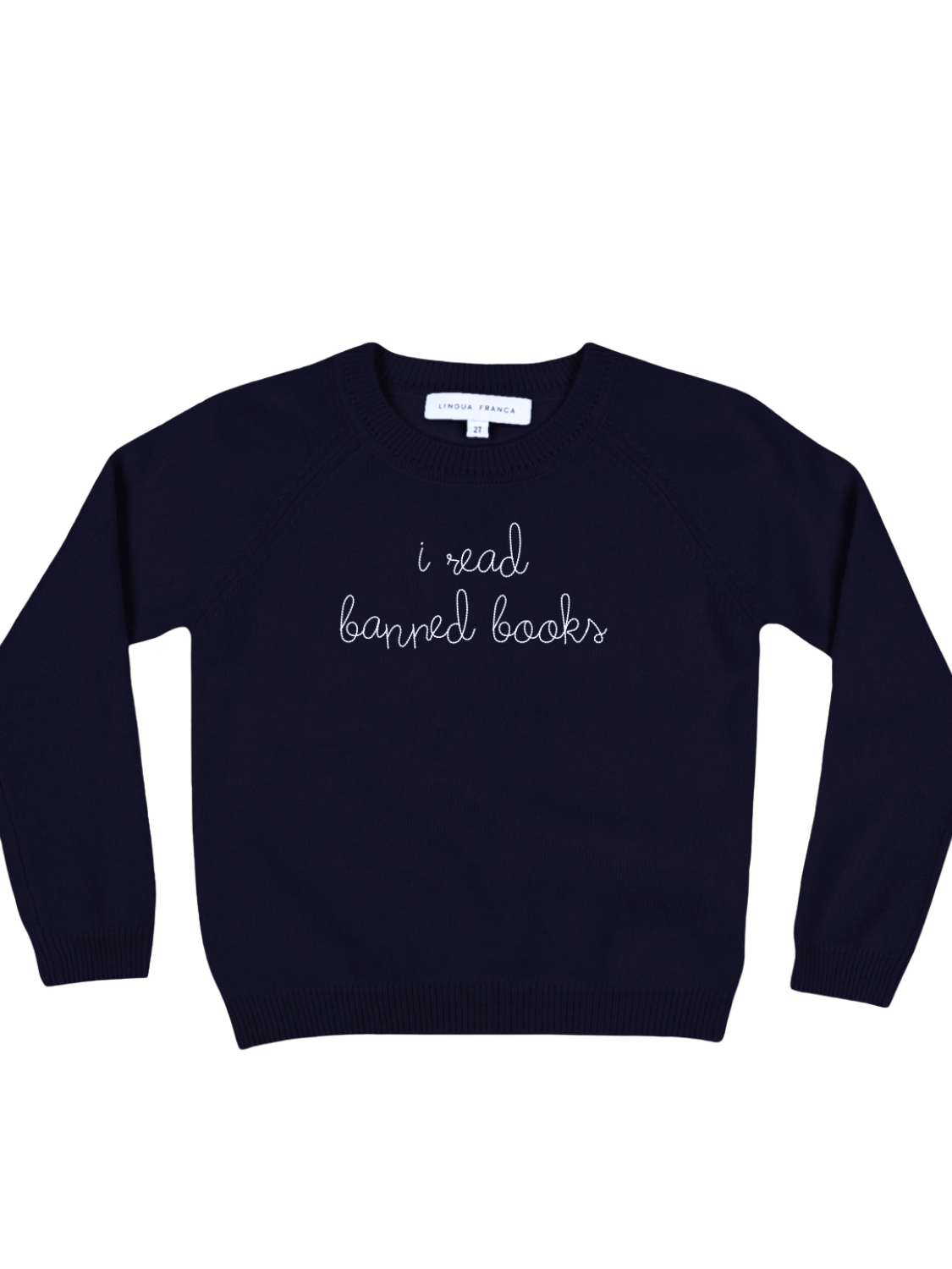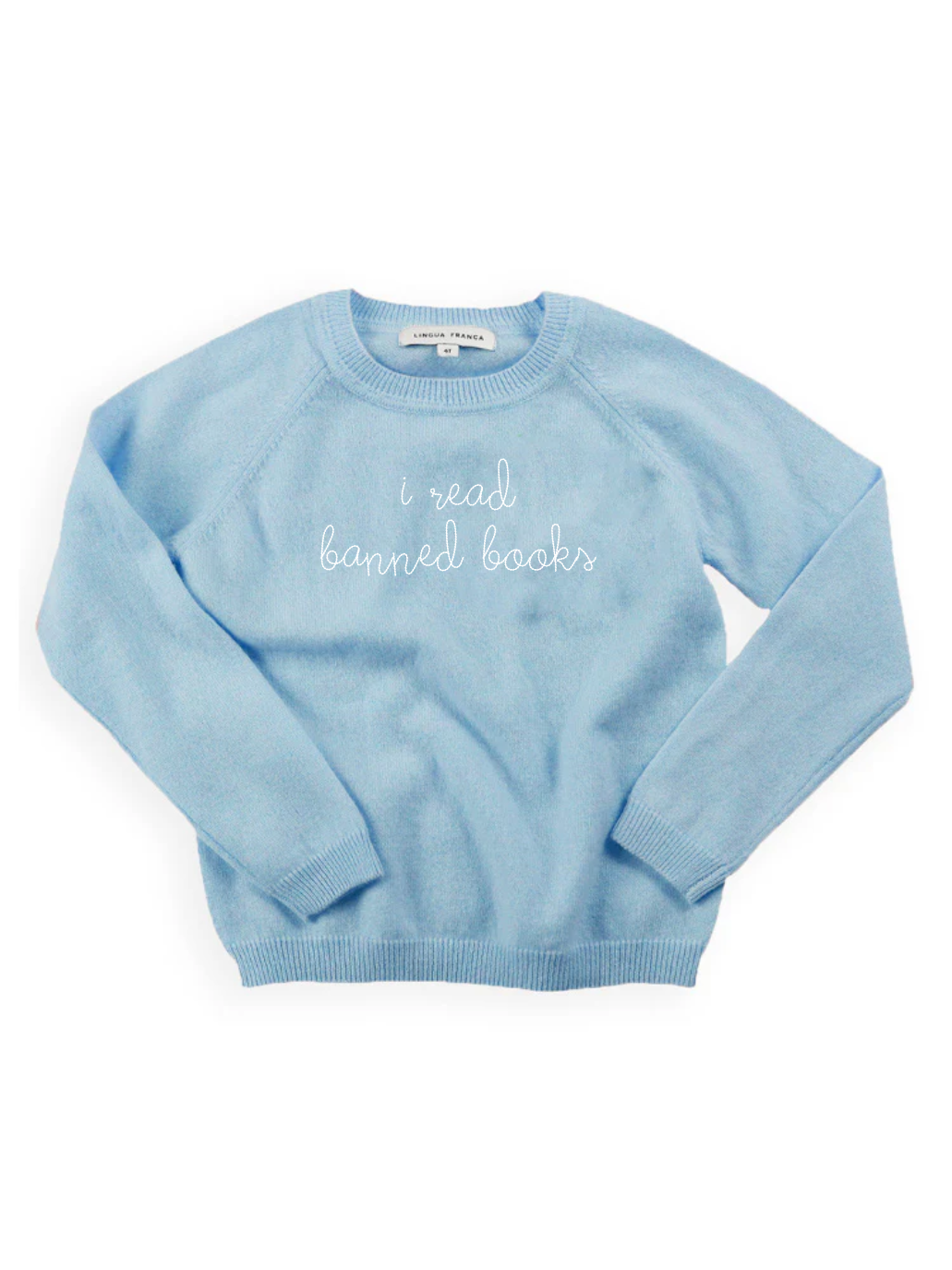 Our classic kids' crewneck with "i read banned books" hand-embroidered across the front.