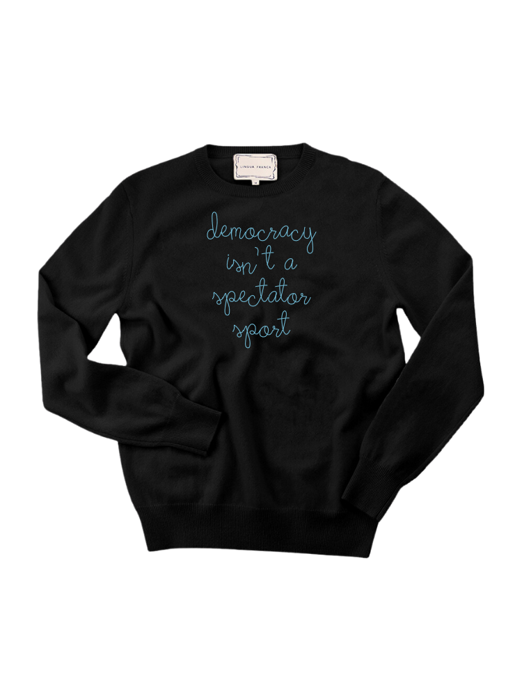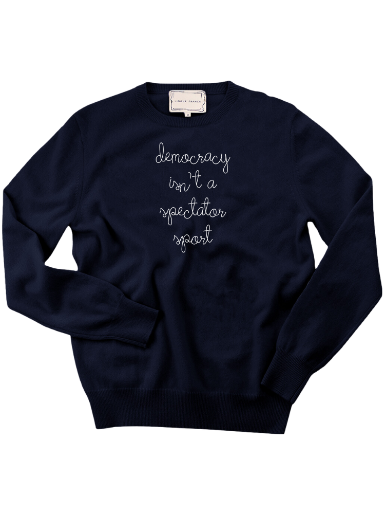 Our classic cashmere crewneck with "democracy isn't a spectator sport" hand-embroidered across the front.