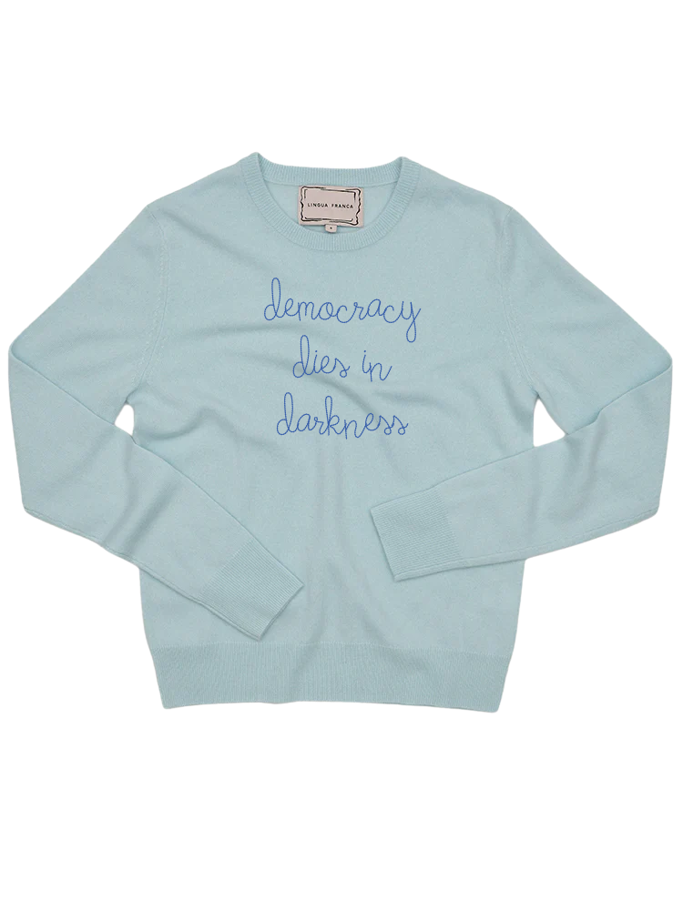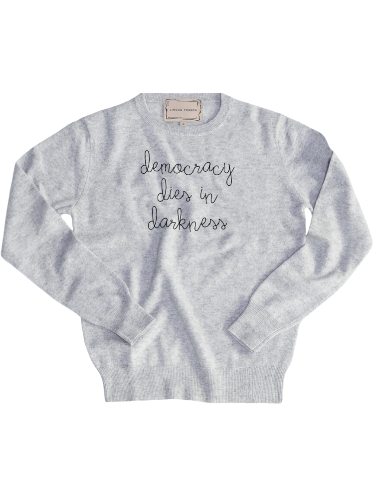 Our classic cashmere crewneck with "democracy dies in darkness" hand-embroidered across the front.