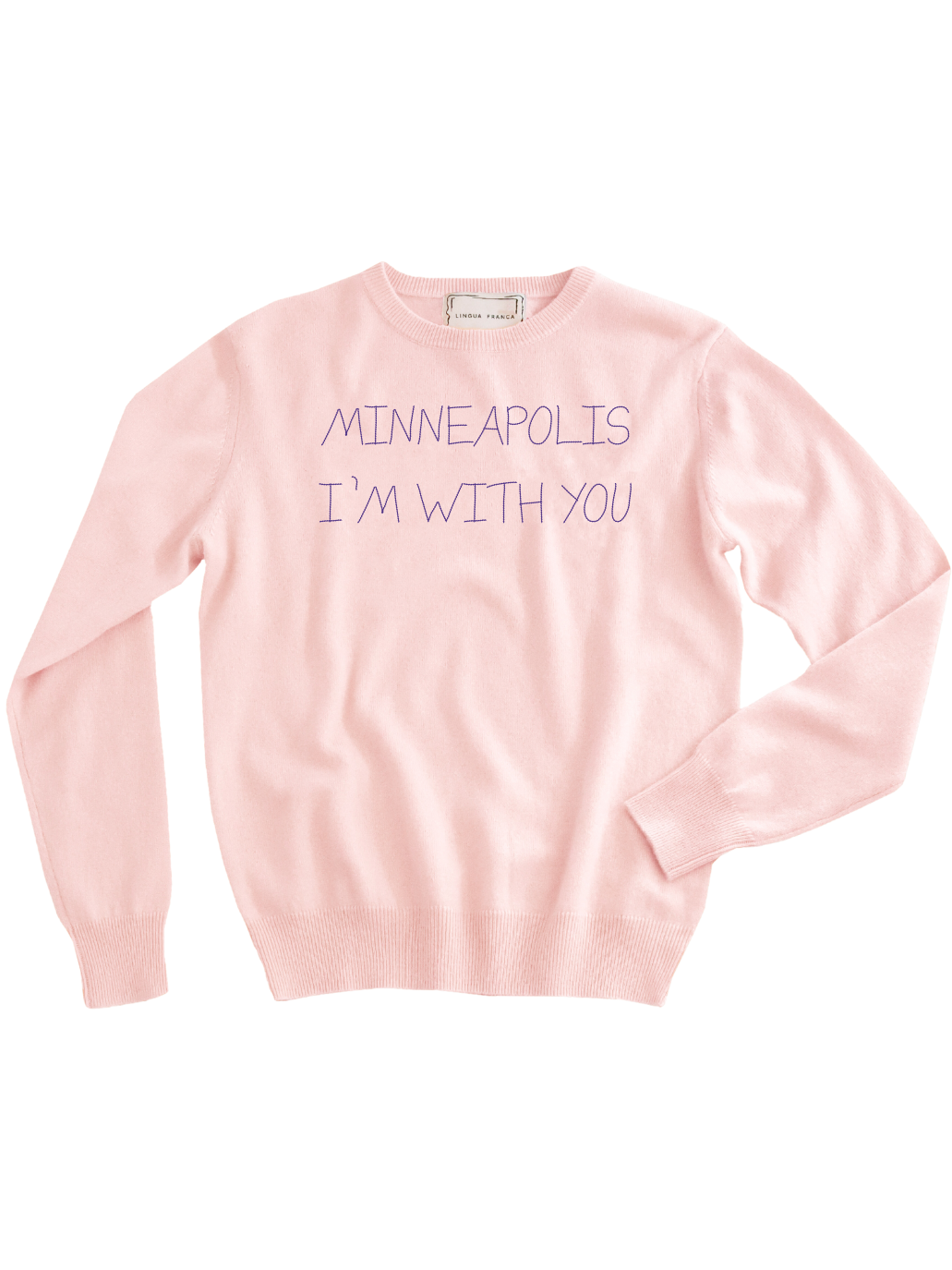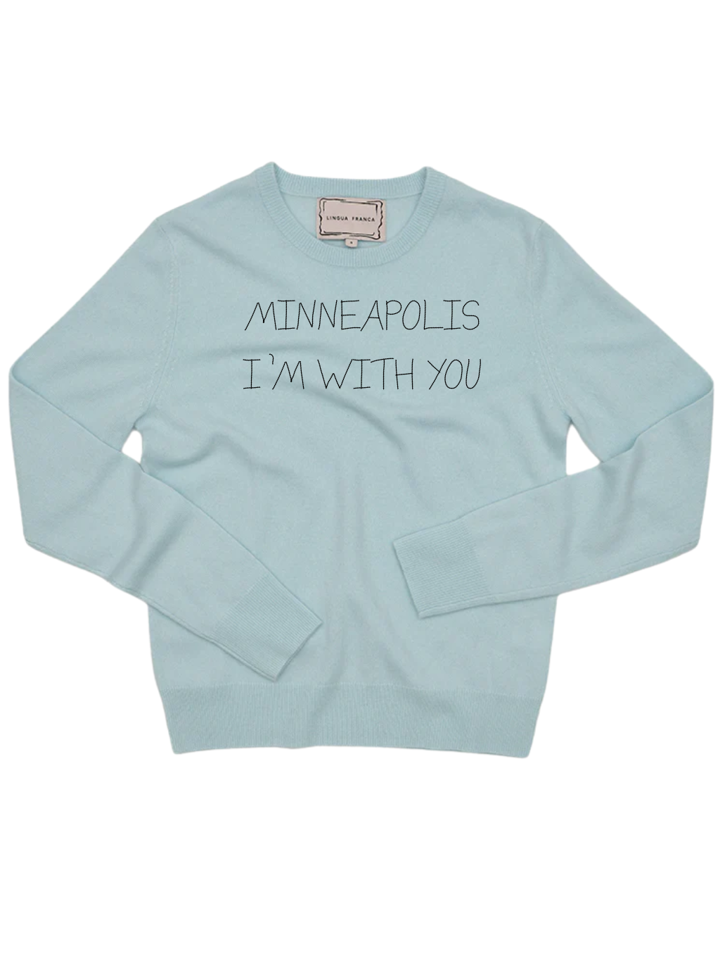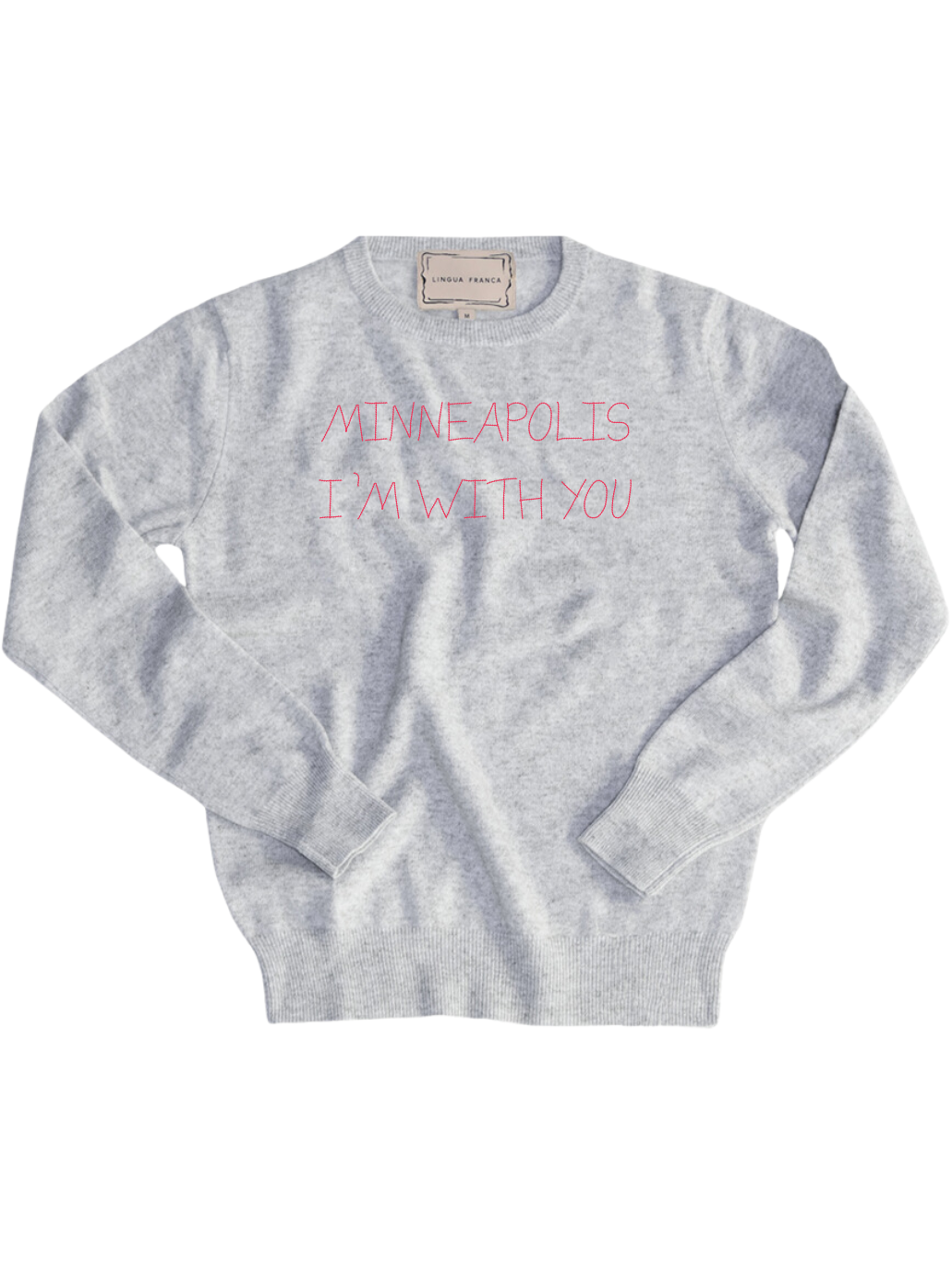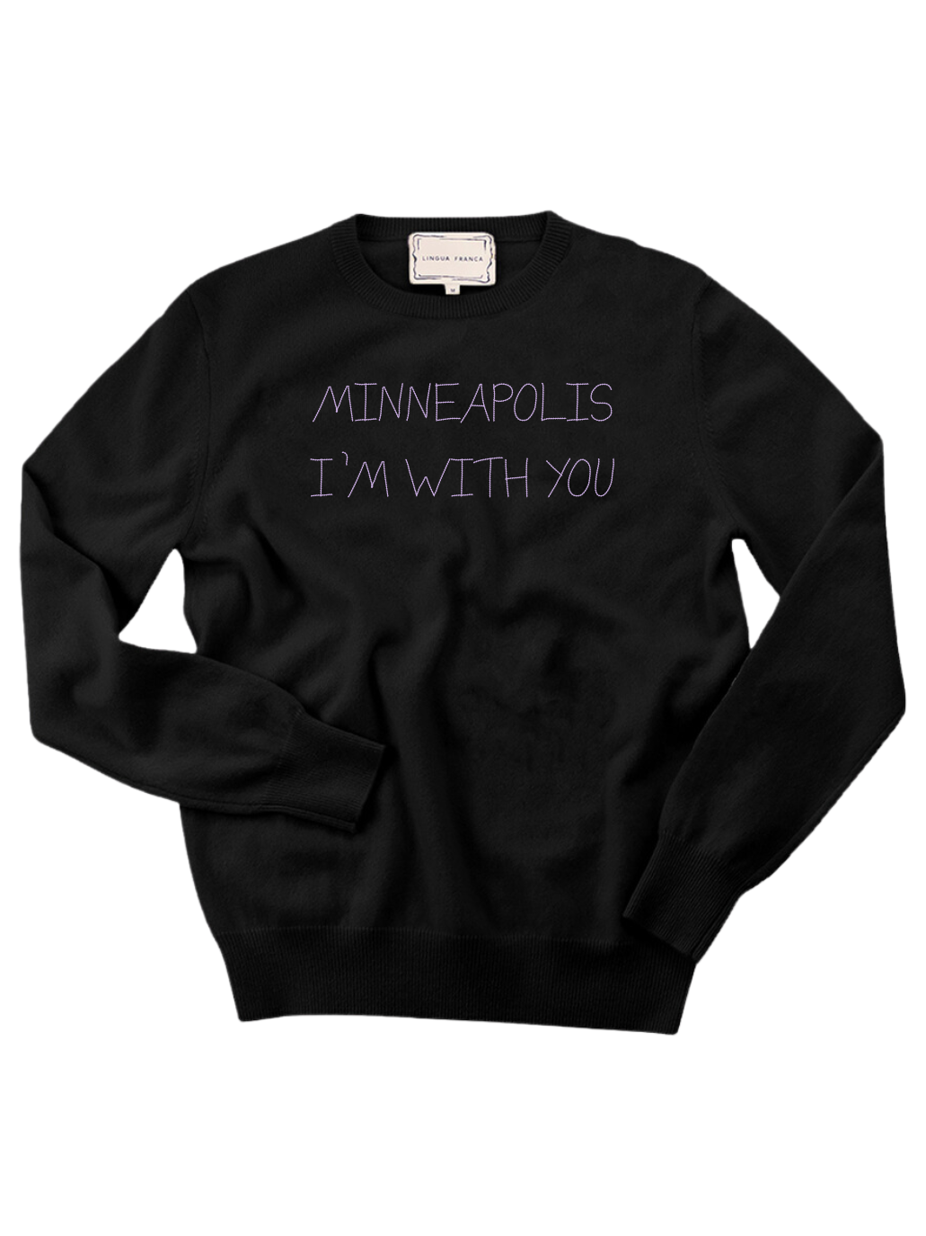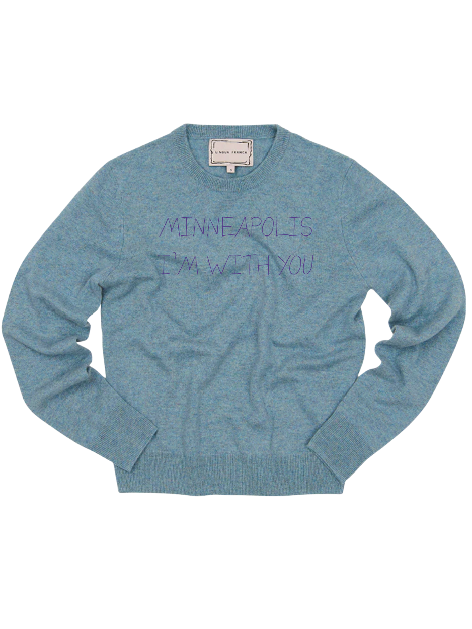 Our classic cashmere crewneck with "minneapolis i'm with you" hand-embroidered across the front. 10% of every purchase will be donated to MIRAC, Minnesota's immigrants rights community*.