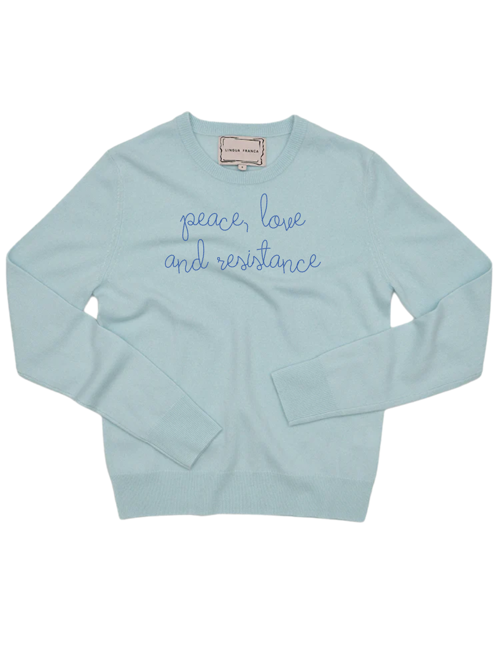 Our classic cashmere crewneck with "peace, love and resistance" hand-embroidered across the front.