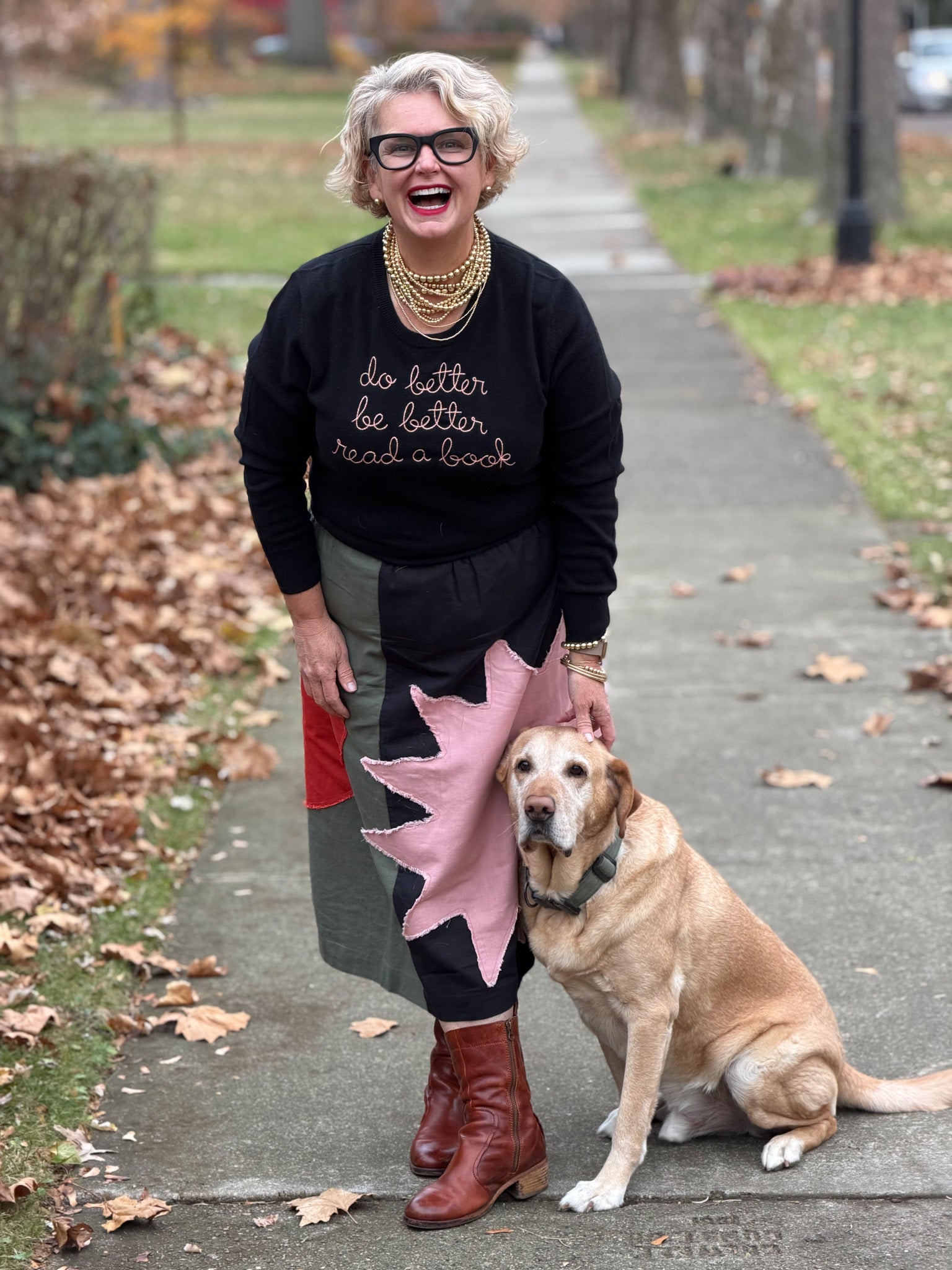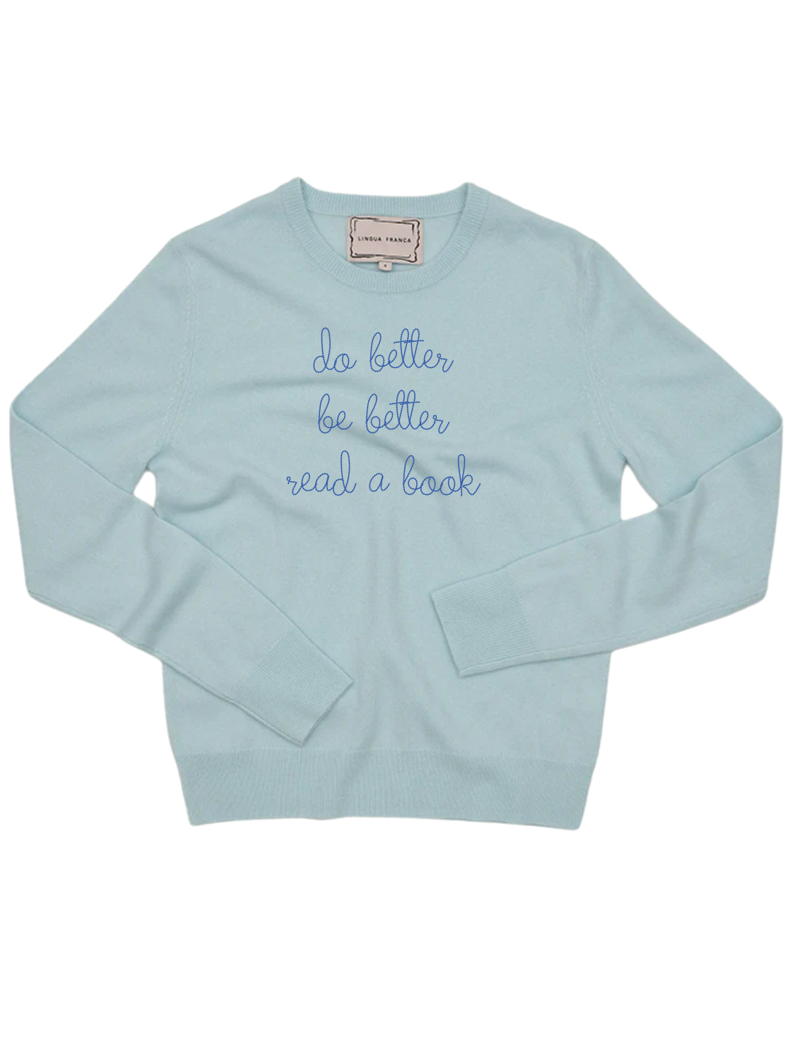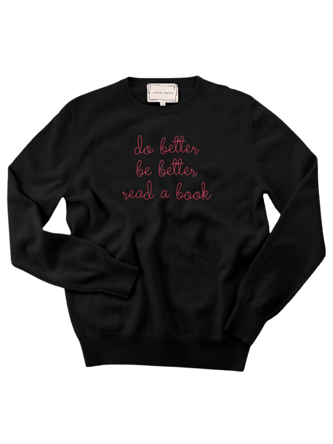 Our classic cashmere crewneck with "do better be better read a book" hand-embroidered across the front.