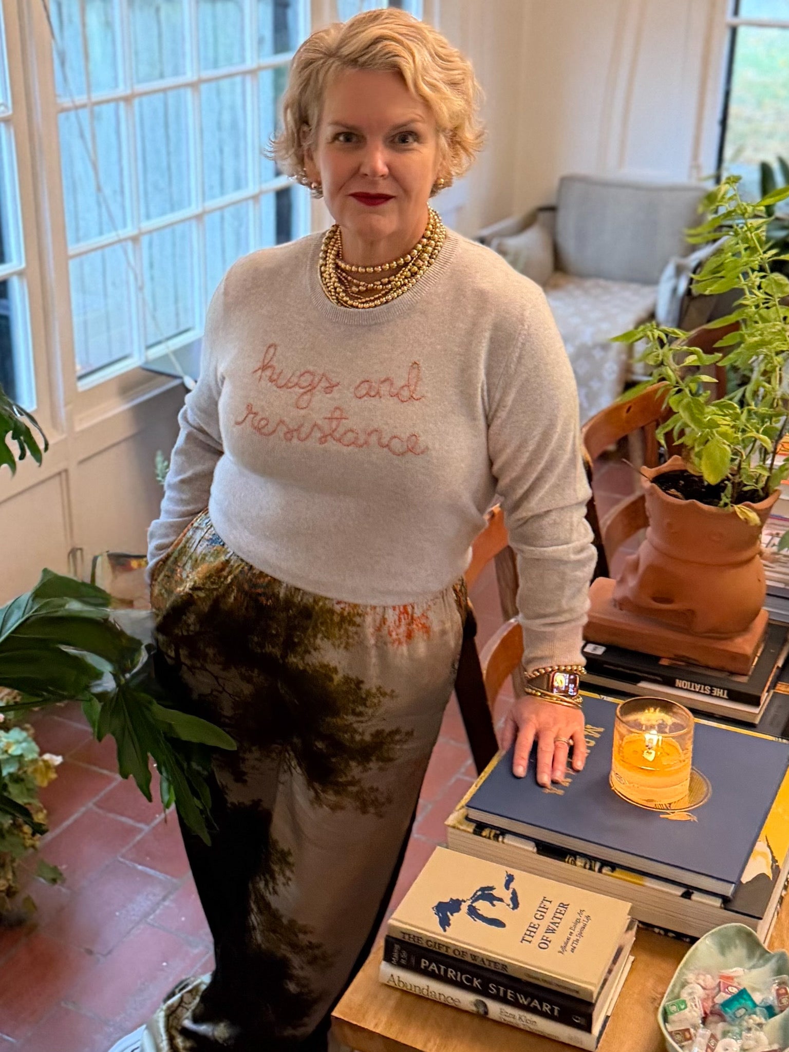 Our classic cashmere crewneck with "hugs and resistance" hand-embroidered across the front.