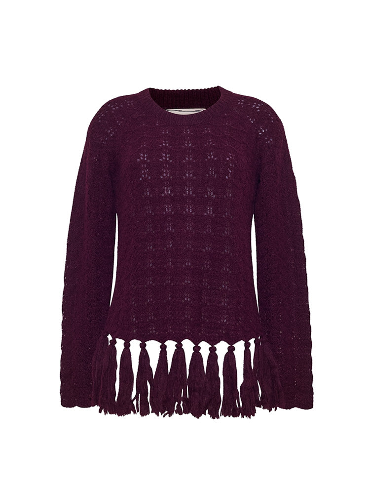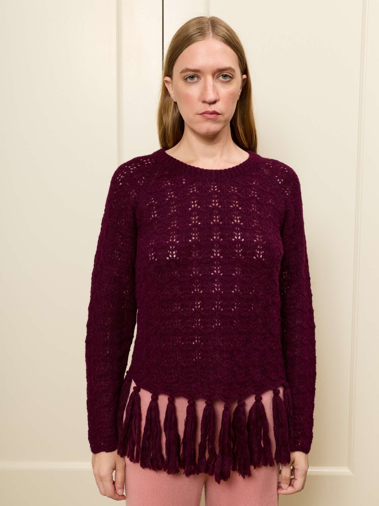 The Fia Scallop Sweater is a pointelle lace knit, featuring yarn fringe detailing at the hem for a textural, handcrafted feel. Designed with an oversized fit and knit by hand from our women partners in Peru, the Fia drapes effortlessly, making it the perfect blend of cozy and statement-making.