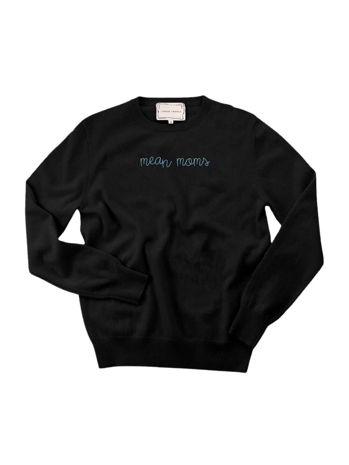 Our classic cashmere crewneck with "mean moms" hand-embroidered across the front.