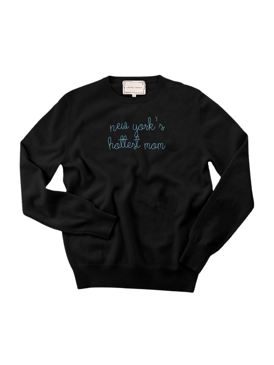 Our classic cashmere crewneck with "new york's hottest mom" hand-embroidered across the front.