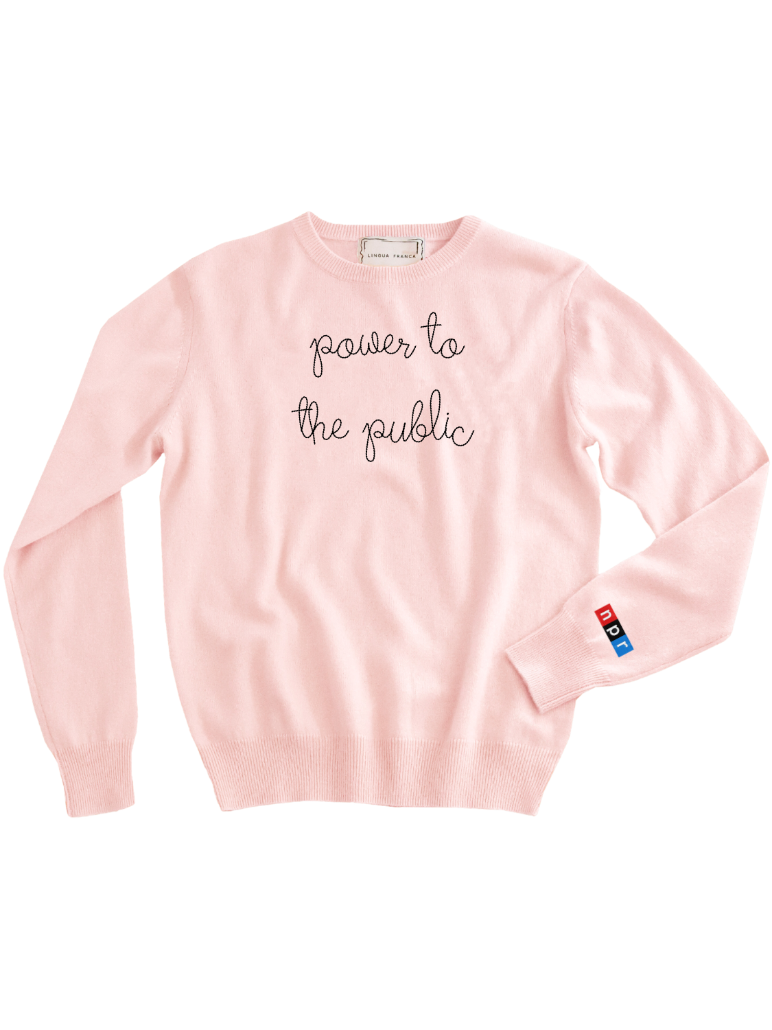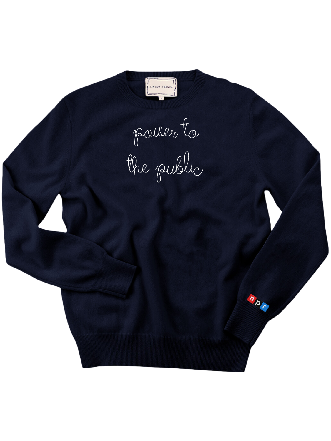 Our classic cashmere crewneck with "power to the public" hand-embroidered across the front.