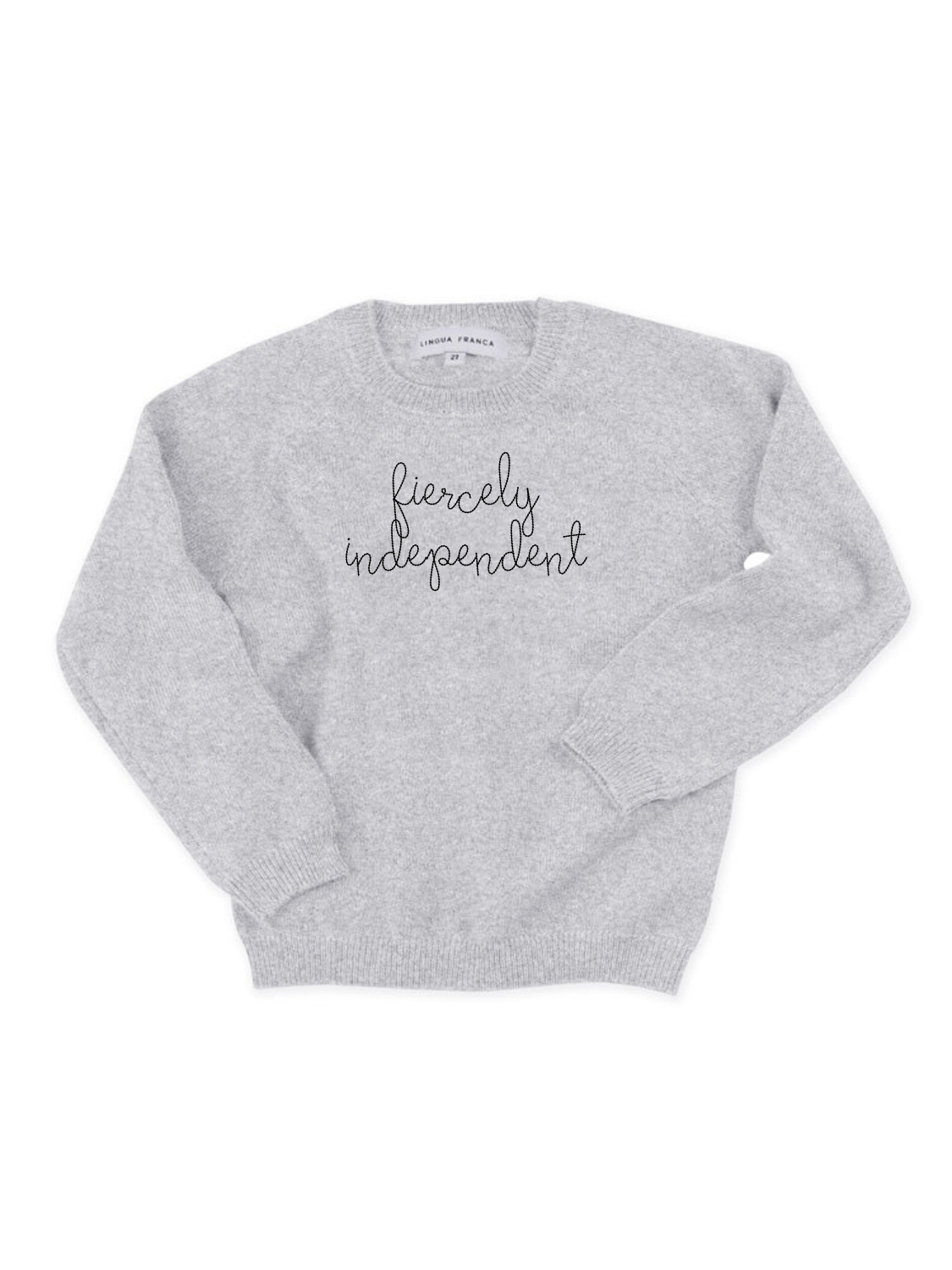 Our classic kids' crewneck with "fiercely independent" hand-embroidered across the front.