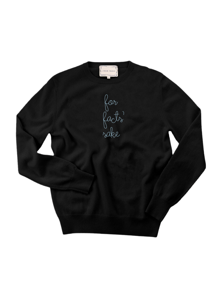 Our classic cashmere crewneck with "for facts' sake" hand-embroidered across the front.