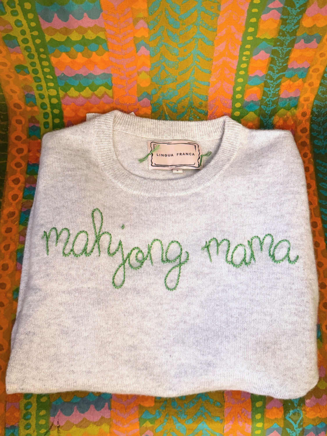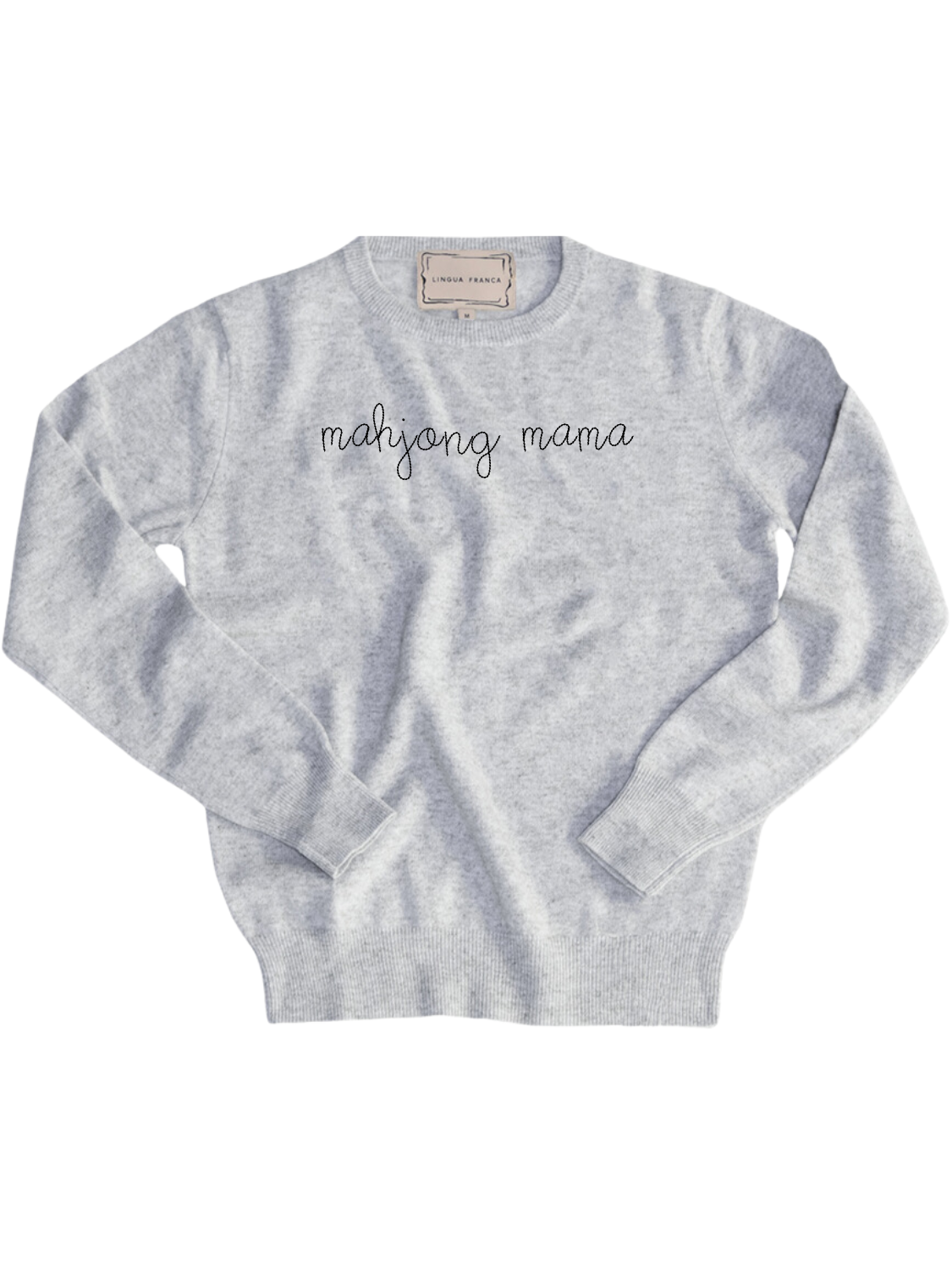 Our classic cashmere crewneck with "mahjong mama" hand-embroidered across the front.