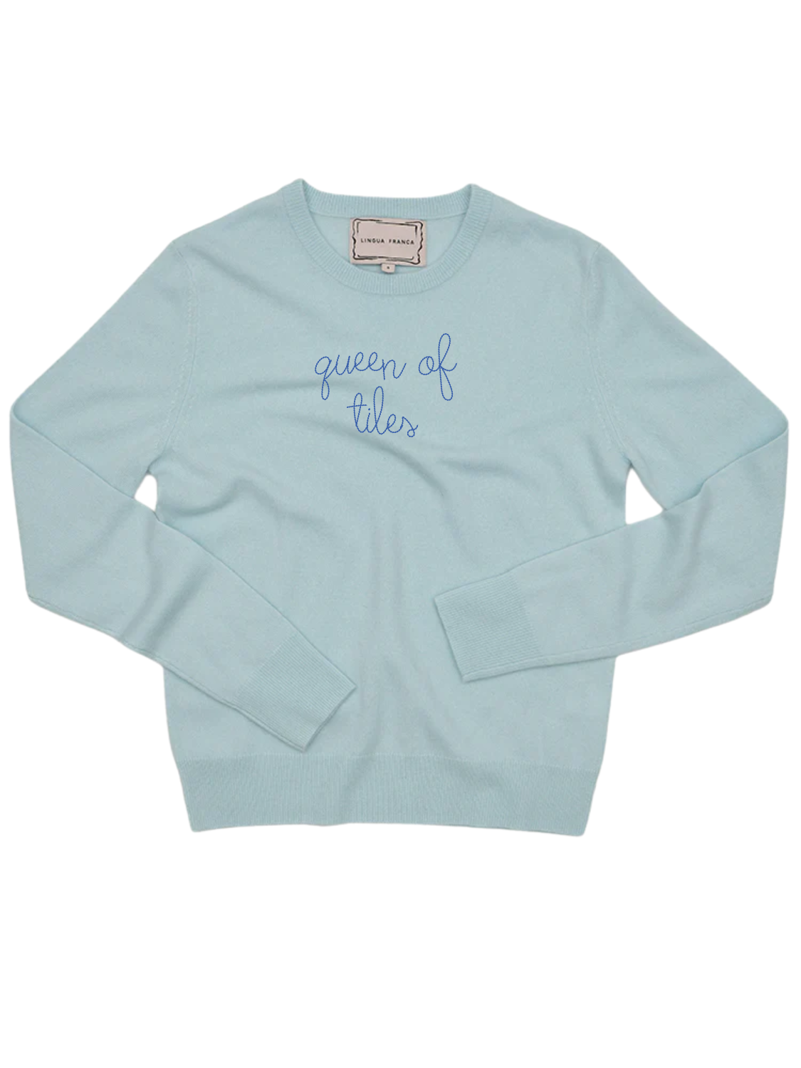 Our classic cashmere crewneck with "queen of tiles" hand-embroidered across the front.