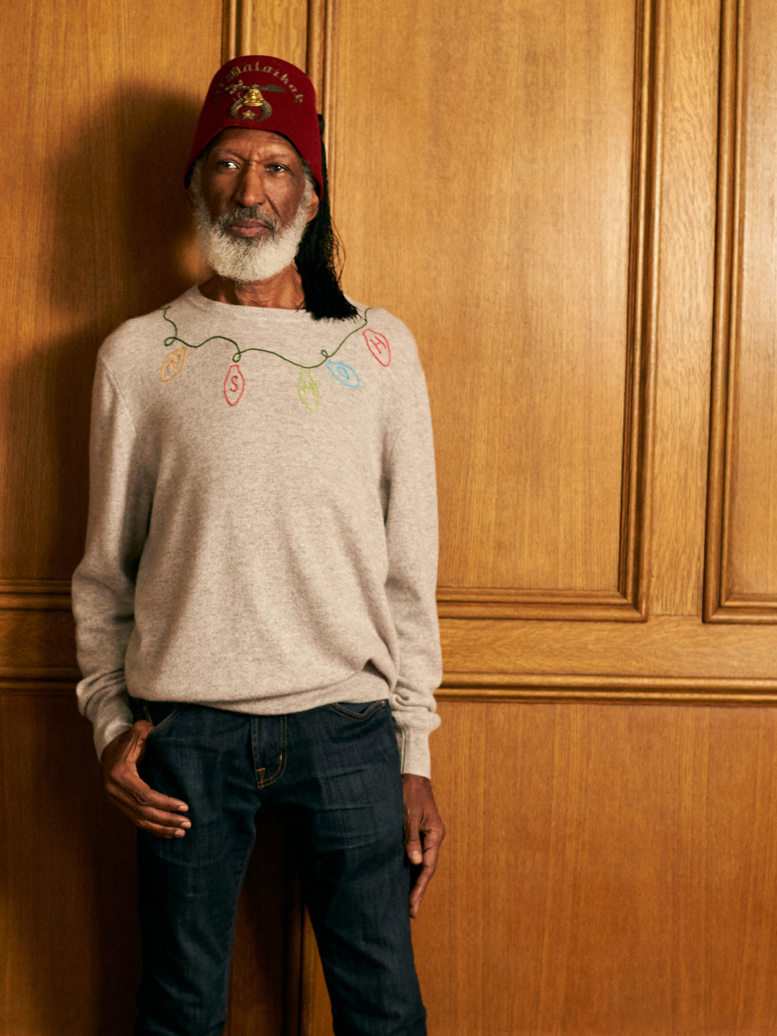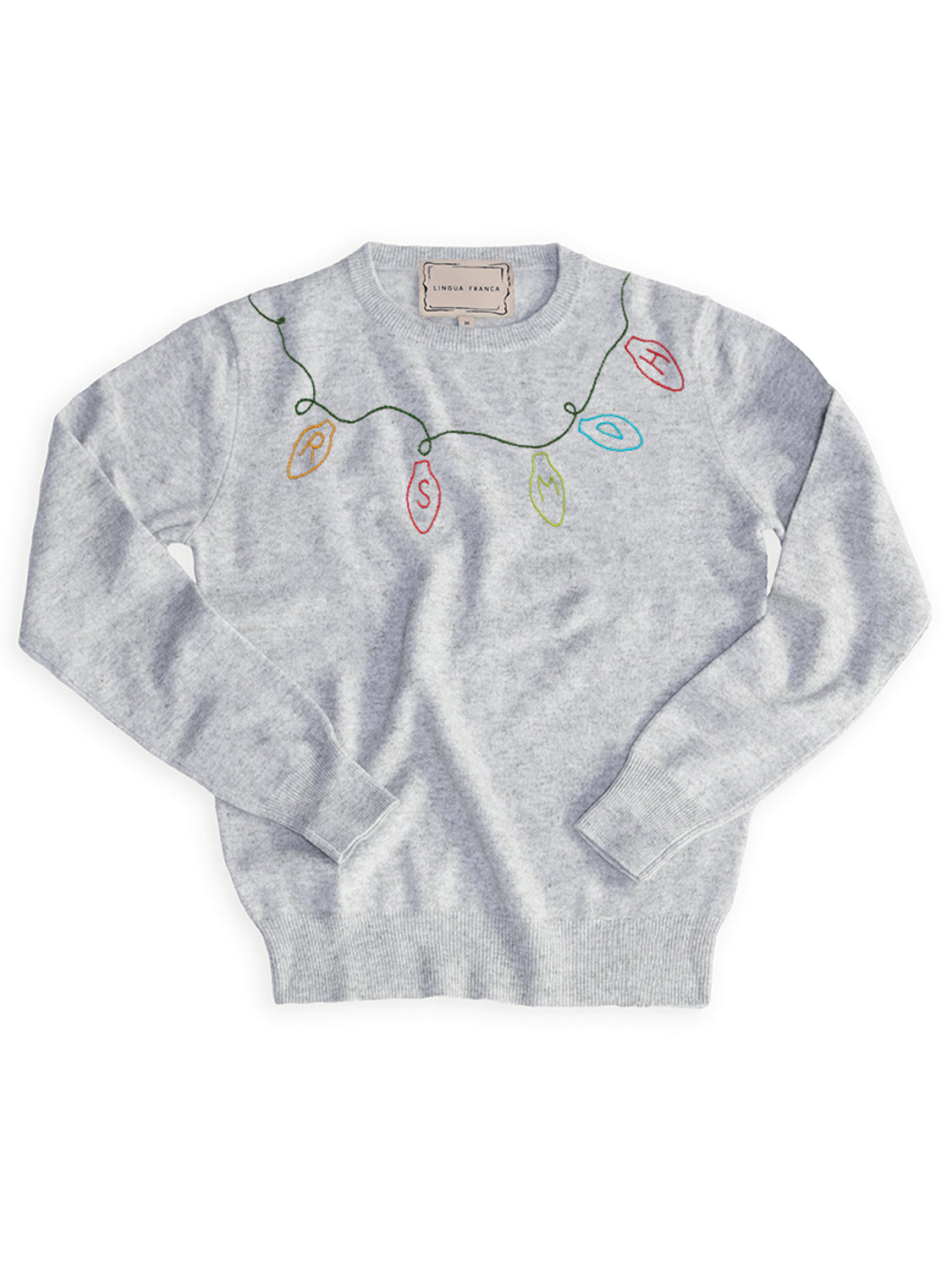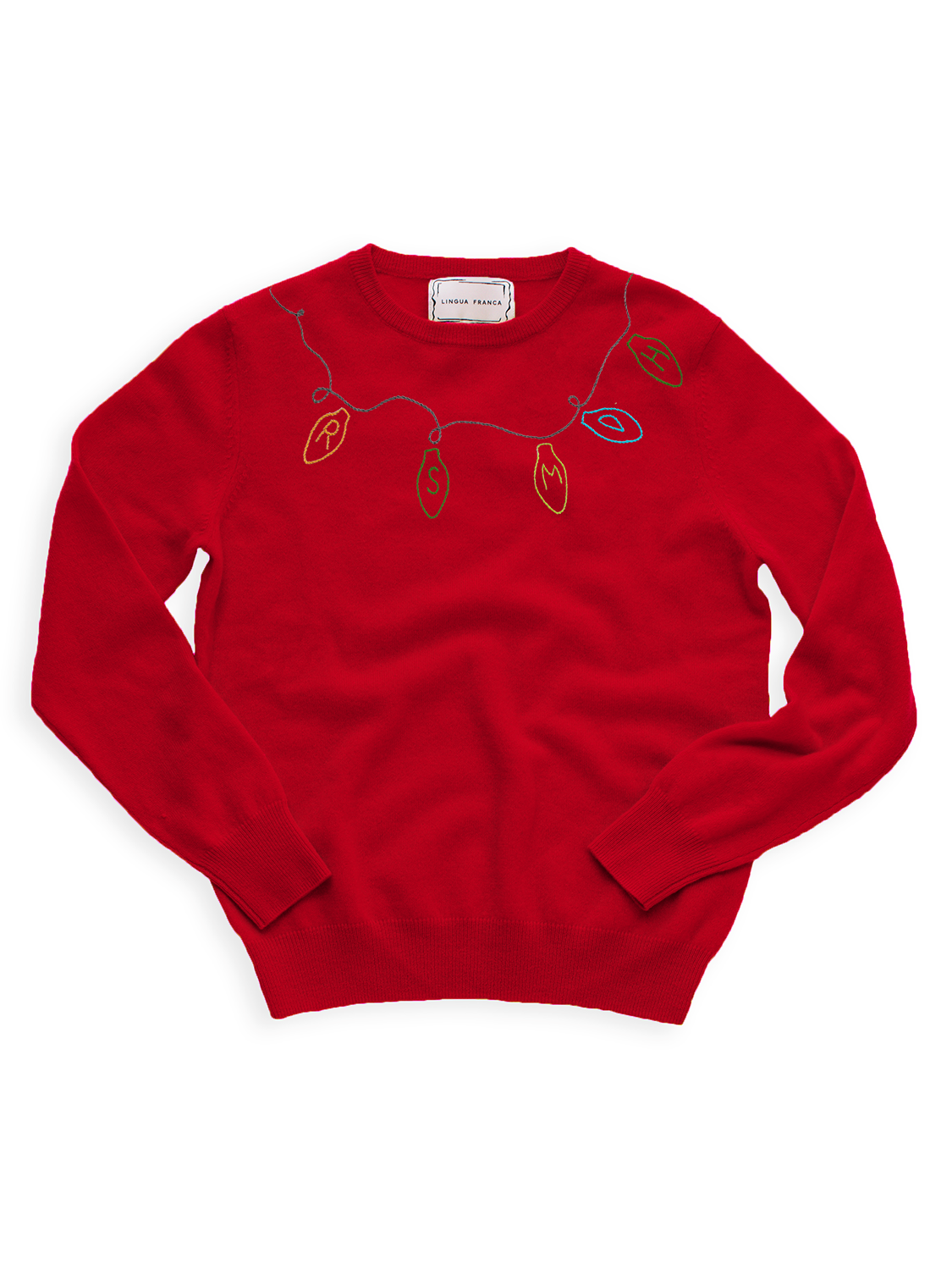 Our classic cashmere crewneck with hand-embroidered holiday lights around the neckline.