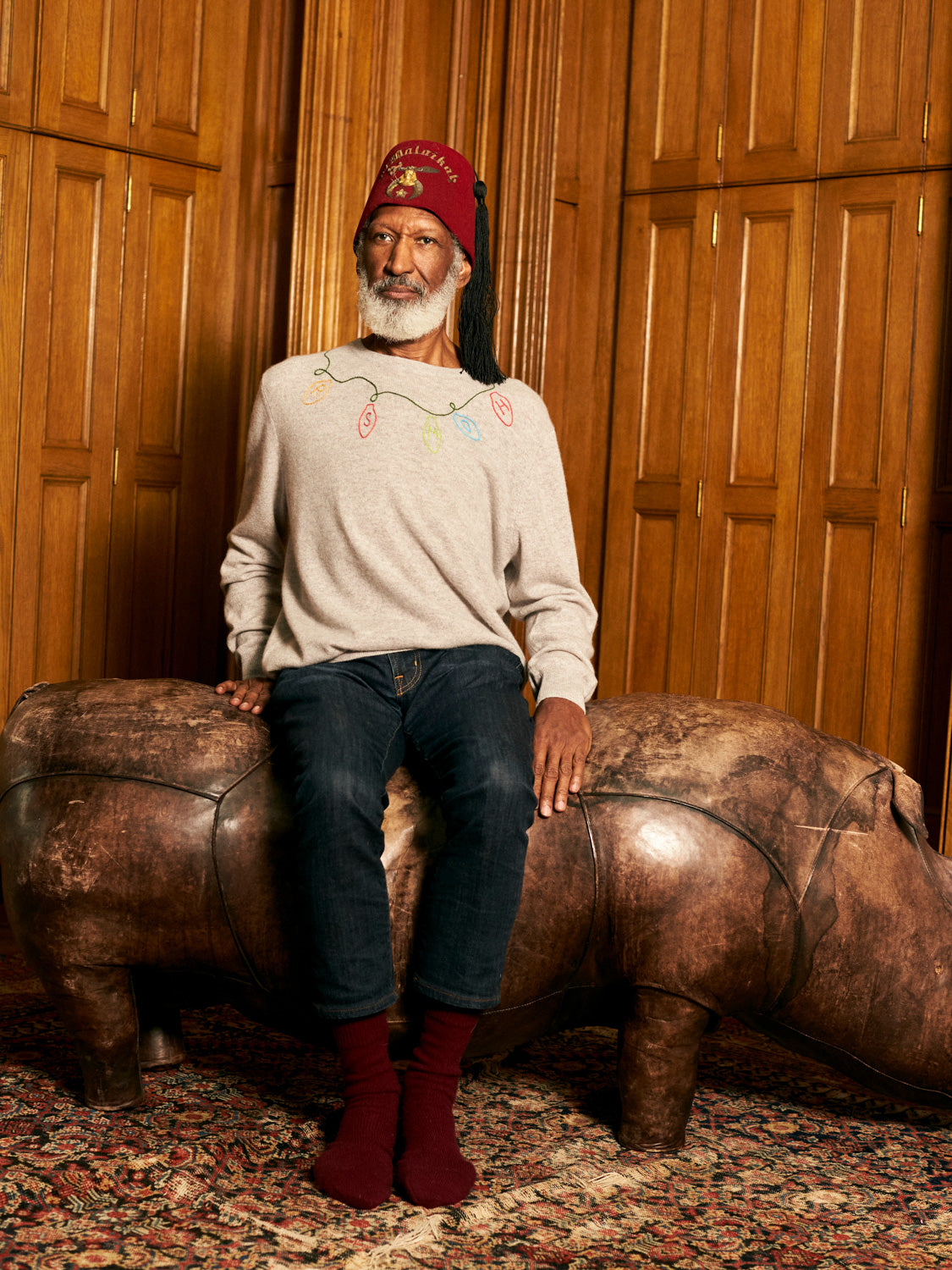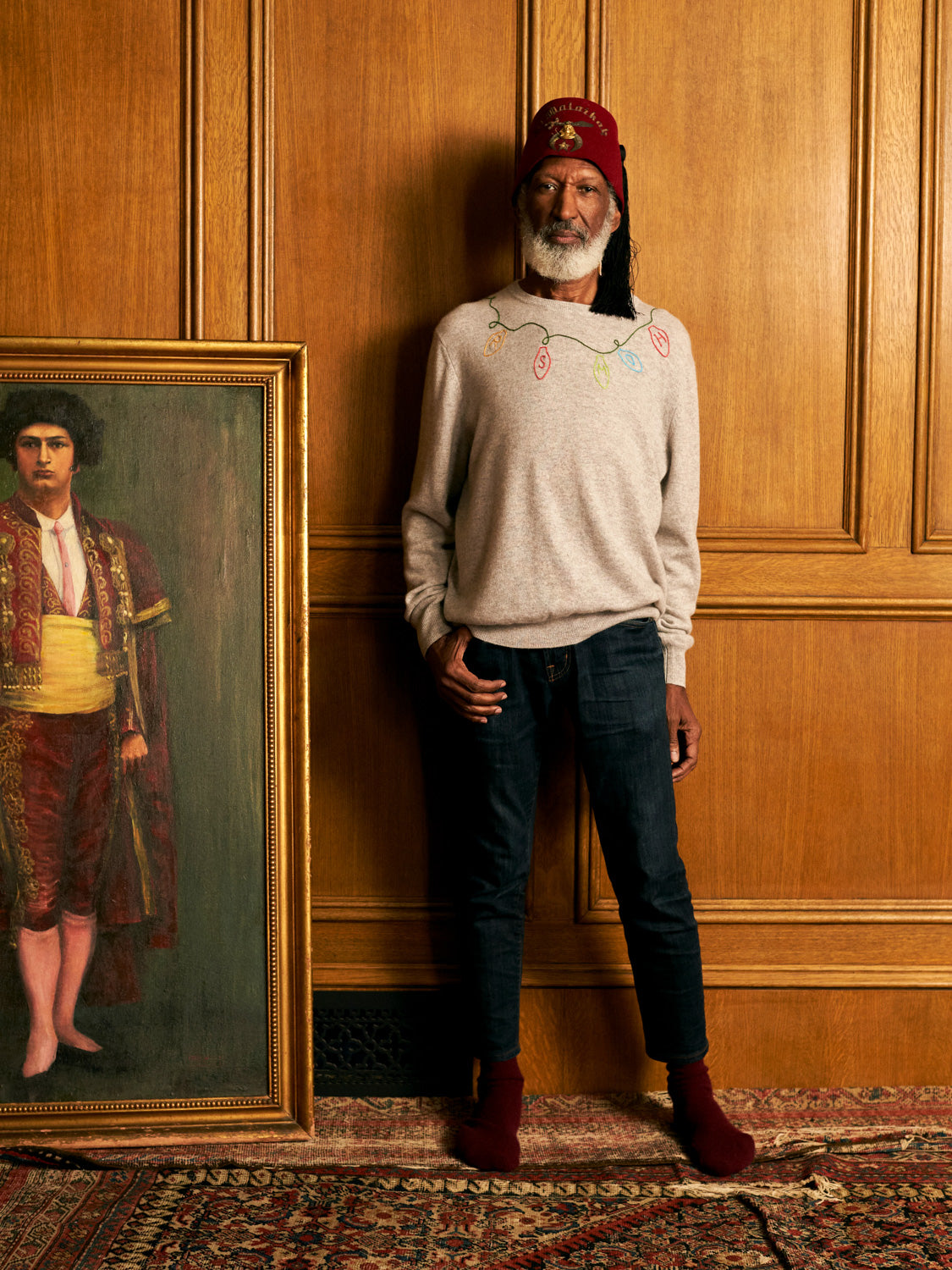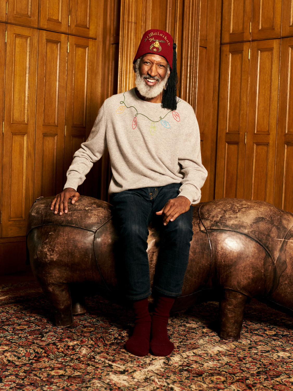 Our classic cashmere crewneck with hand-embroidered holiday lights around the neckline.