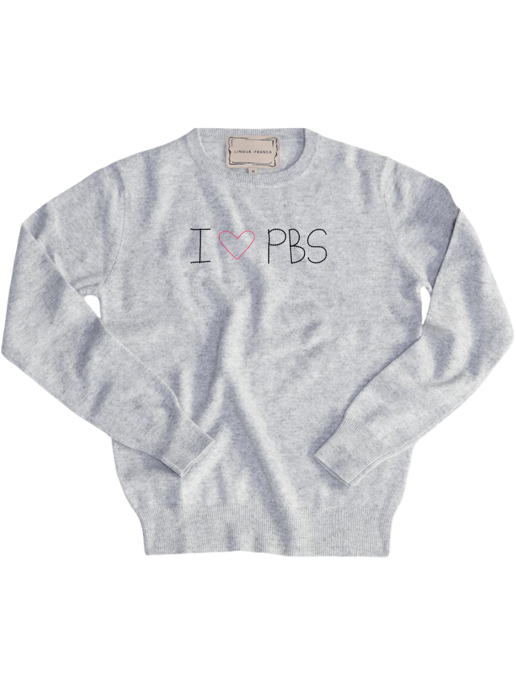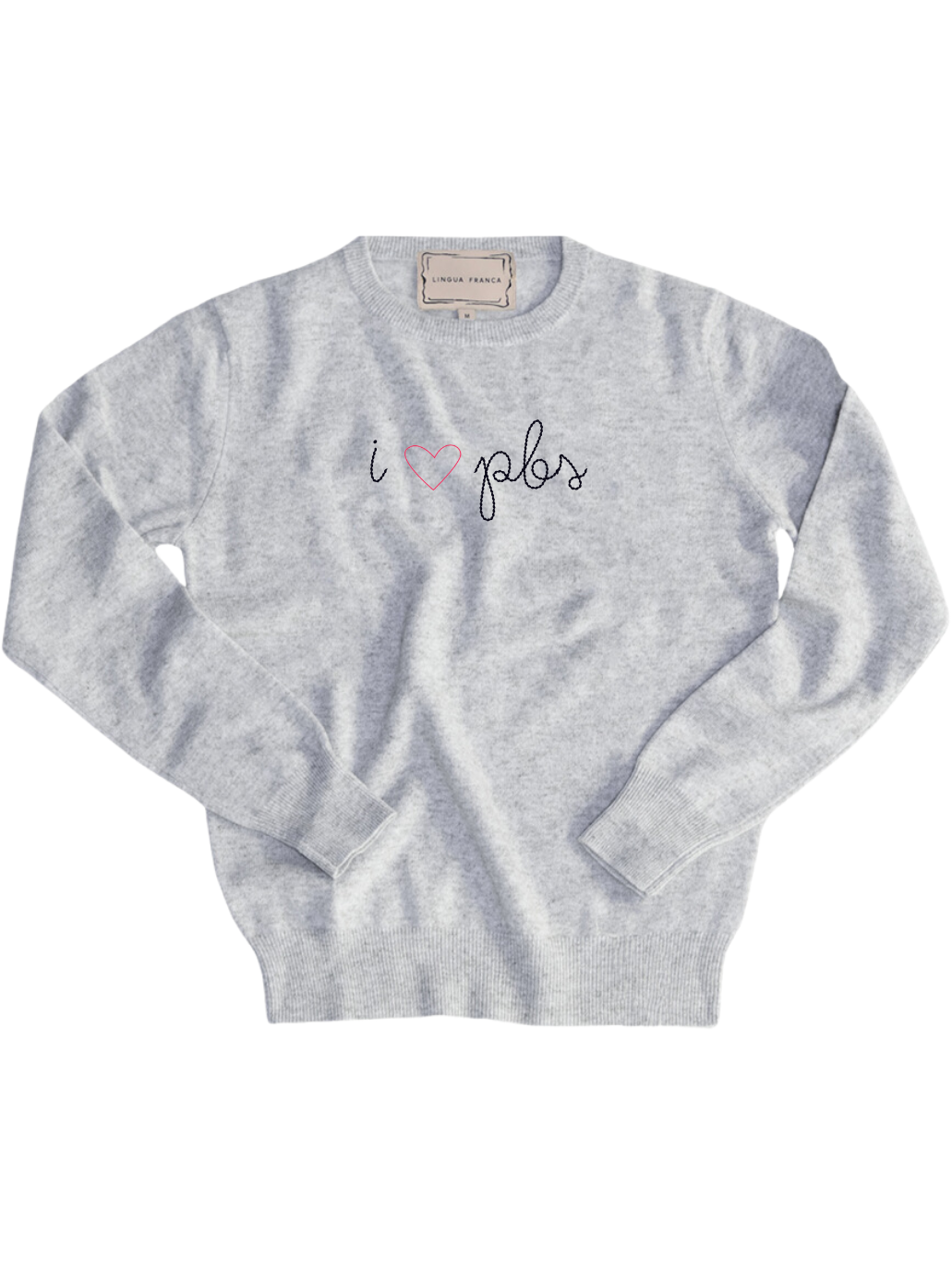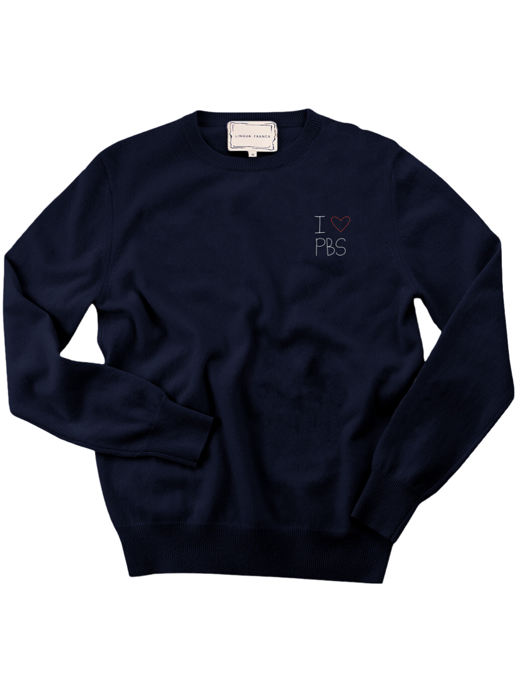 Our classic cashmere crewneck with "i heart pbs" hand-embroidered across the front.