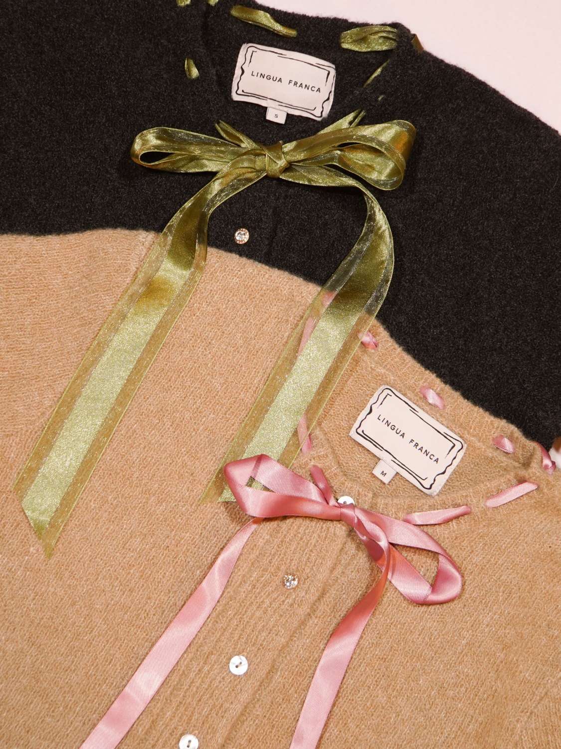 Featuring a convertible ribbon detail - change out the ribbon with any old ribbon you have lying around to get a new look each time! This short-sleeve crewneck cardigan is crafted from luxuriously soft boucle yarn, offering a classic silhouette. Finished with delicate buttons and subtle ribbon-inspired details, it’s a timeless layering piece.