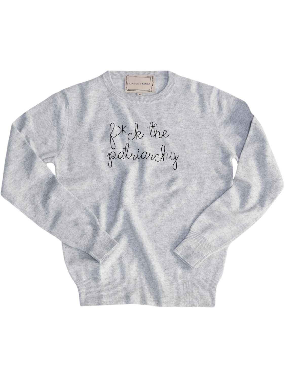Our classic cashmere crewneck with "f*ck the patriarchy" hand-embroidered at our studios in NYC across the front. True to size.