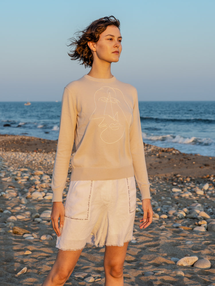 You’ll want to live in this lightweight, fine-gauge sweater, crafted from a luxurious silk/cotton blend for ultimate comfort. Now in a fresh new canvas color, it features a hand-embroidered Robert Lax drawing on the front.