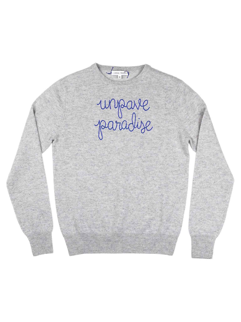 Our classic cashmere crewneck with "unpave paradise" hand-embroidered across the front.