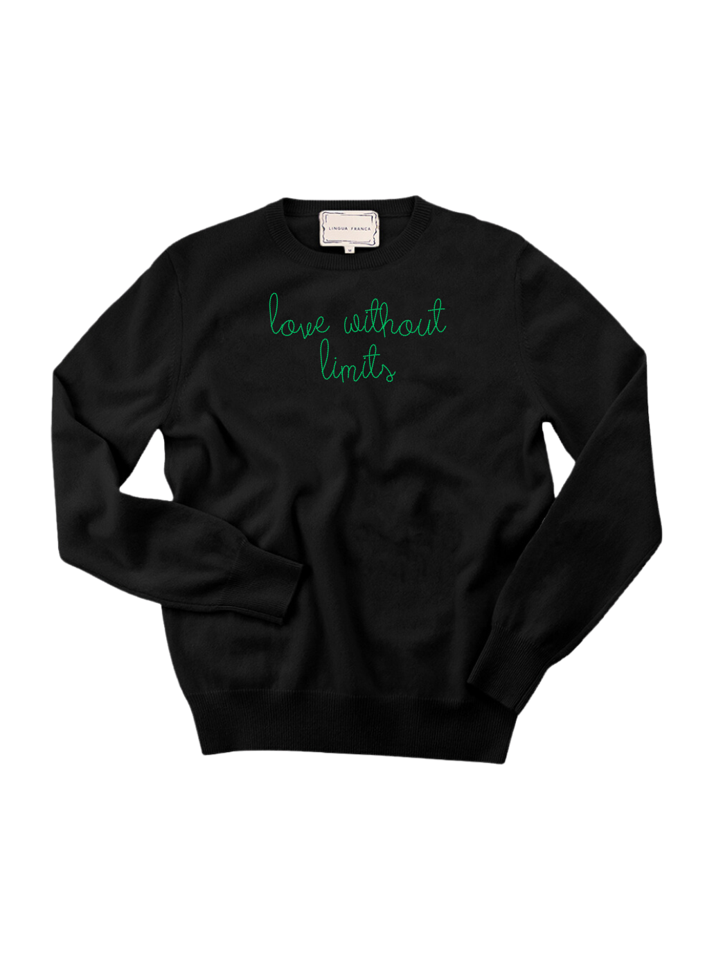 Our classic cashmere crewneck with "love without limits" hand-embroidered across the front.
