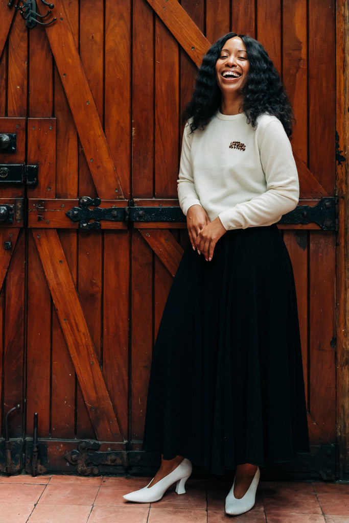 Lingua Franca 100% sustainably sourced cashmere sweater with hand-beaded "jeepers" patch made from silver-lined glass micro bulge beads. Delicate chain stitch border, applied by hand in NYC.