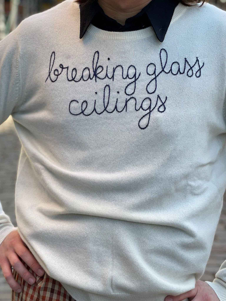 Our classic cashmere crewneck with "breaking glass ceilings" hand-embroidered across the front.