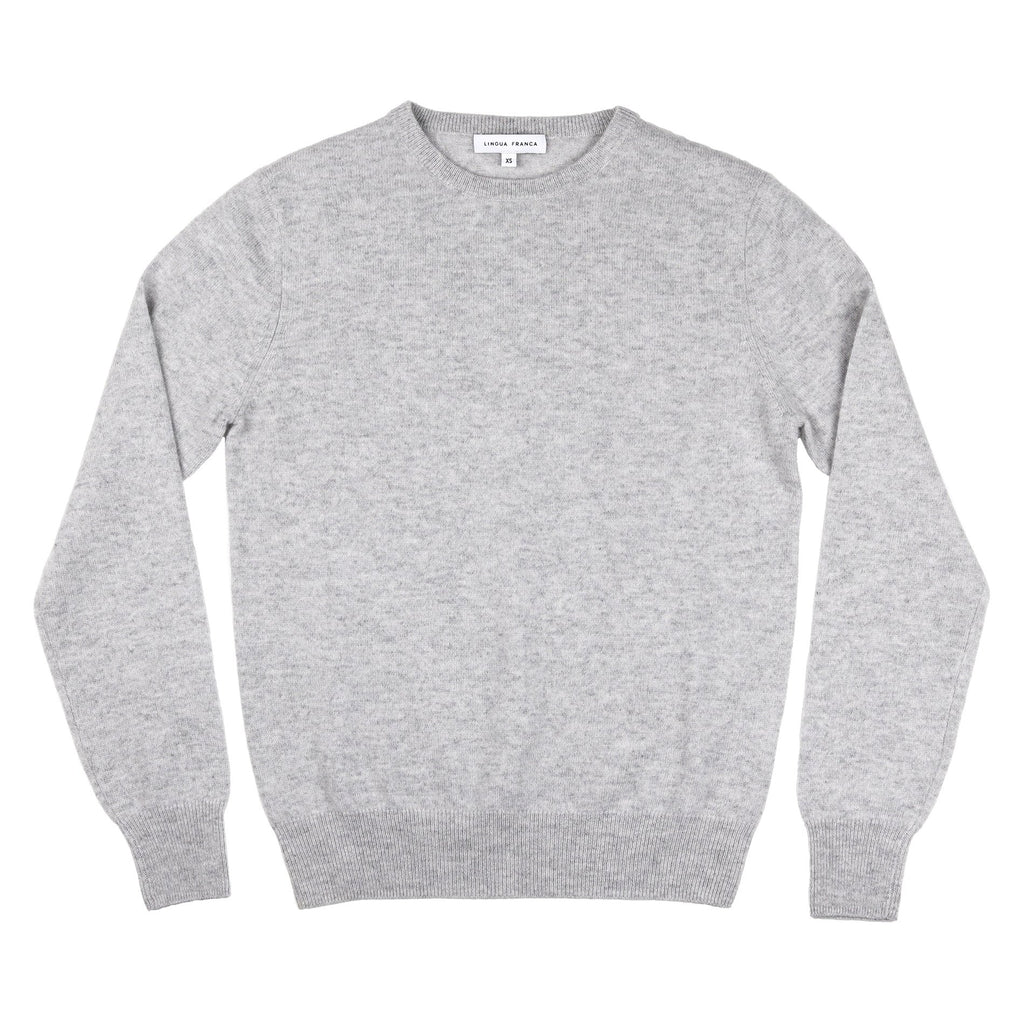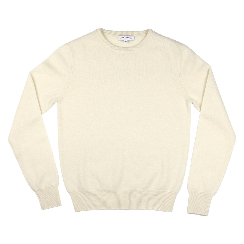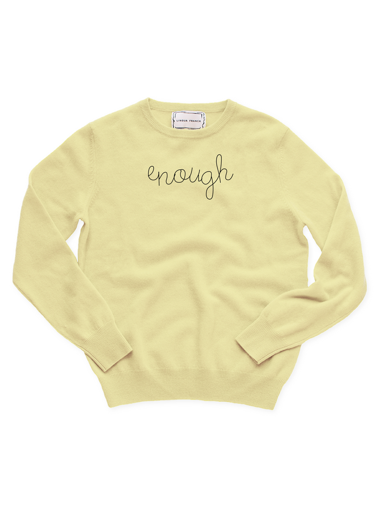 Our classic cashmere crewneck with "enough" hand-embroidered across the front.
