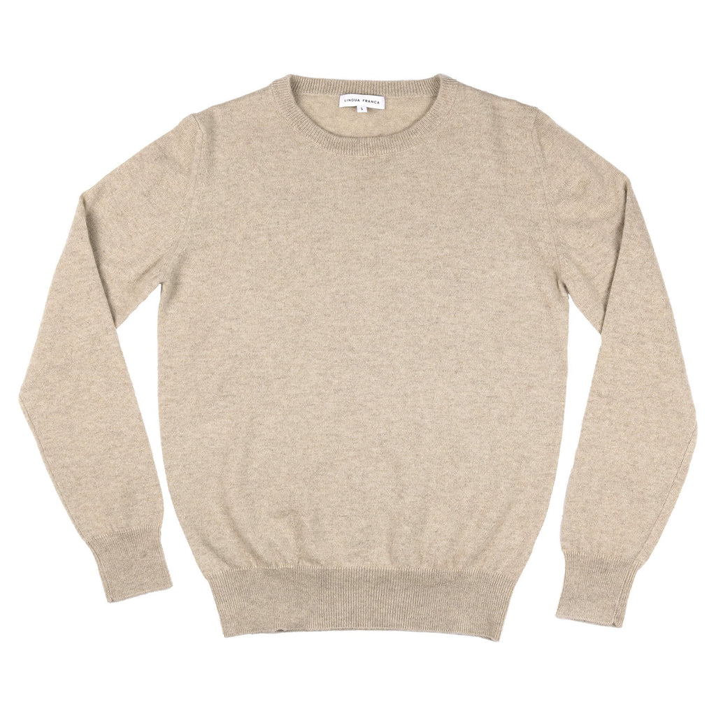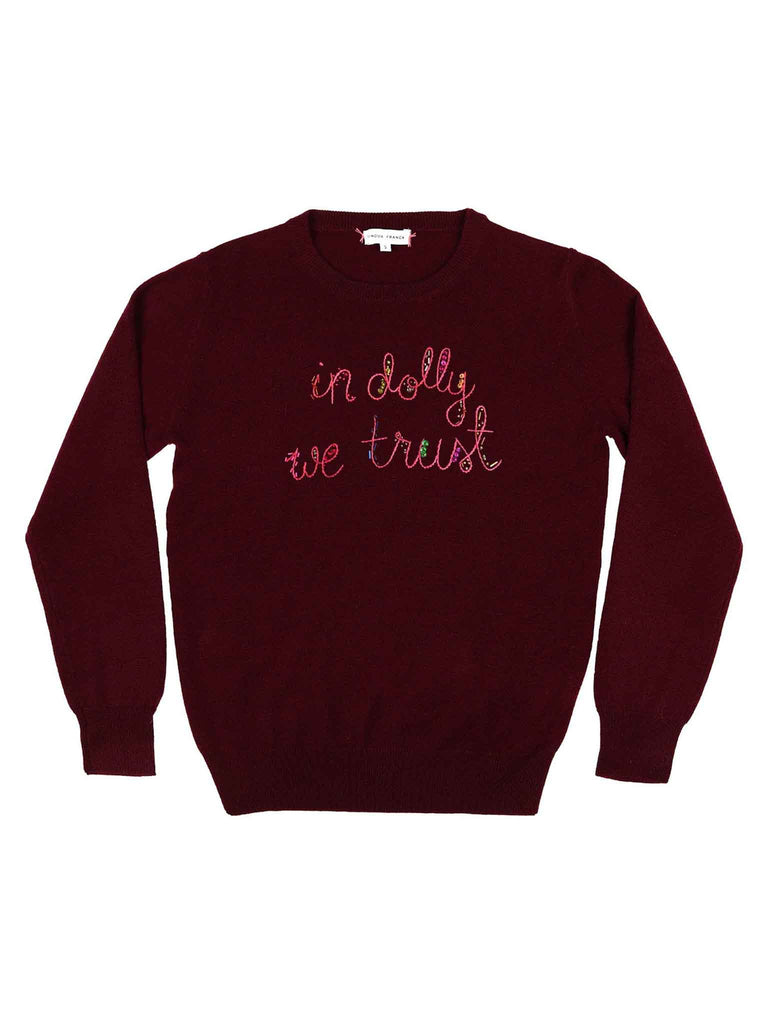 Our classic cashmere crewneck with "in dolly we trust" hand-embroidered across the front.