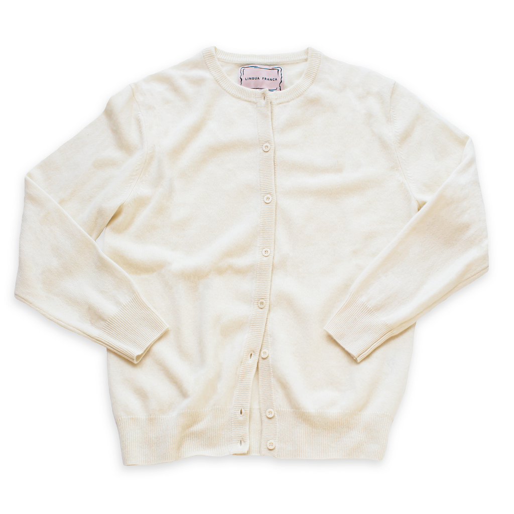 Our classic cashmere cardigan with "the end." embroidered over the heart. Offered on Lilac, Navy, Kelly Green, and Cream cashmere.